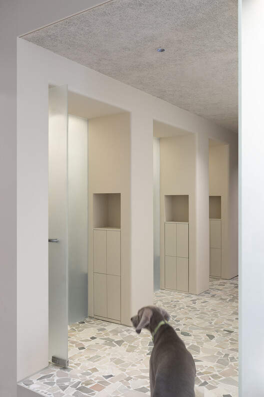 宠物狗们的入口在店南侧,而猫则在东侧。不同类的宠物和它们的主人在不同的区域通行,避免了动物之间可能发生的对峙和过道的拥挤。地面之上,猫咪们可以自由攀爬,上至他们专属的游戏区,一块仿佛漂浮在空中的亚克力板。店内的最深处,是连排的“酒店”房间,让寄养的宠物们可以在更安静私密的环境内短暂居住。在构思一个宠物专属的体验店时,Office AIO秉持着人道善待动物的理念。宠物不是我们的附庸,而是我们生态环境中的一份子。团队以专业的空间设计能力作为手段,动物的身心健康作为目标,打造出了一个不仅视觉上清朗舒适的空间,也是一个尊重动物的环境。
