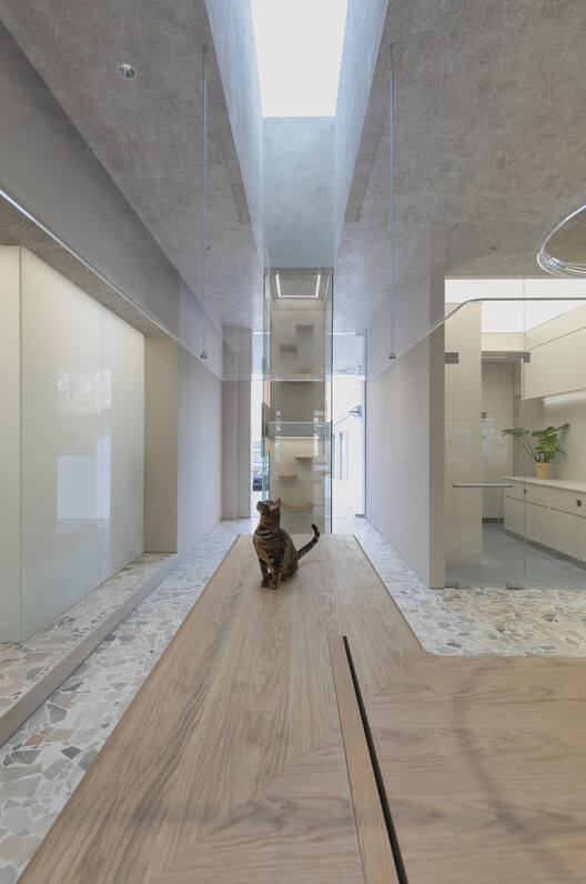 对Office AIO来说,宠物店不该是一个冷冰冰的交易场所或医院式的诊所中心。它是动物们短暂停留的地方,而他们也如人类一样有特定的偏好。宠物行业习惯将宠物作为产品,放在路人经过的店面后,招徕路人的关注。对于活生生的动物而言,这些关注实际上是一种不间断的打扰。为此,设计特意将宠物安置在远离外墙的玻璃体中,全层高的电磁玻璃既可分为不同的“楼层”让宠物们安静地憩息,也从内遮蔽行人的注视。设计并不旨在满足好奇的消费者,而是将动物们奉为首要的客人。