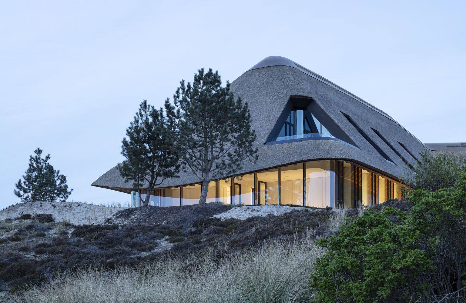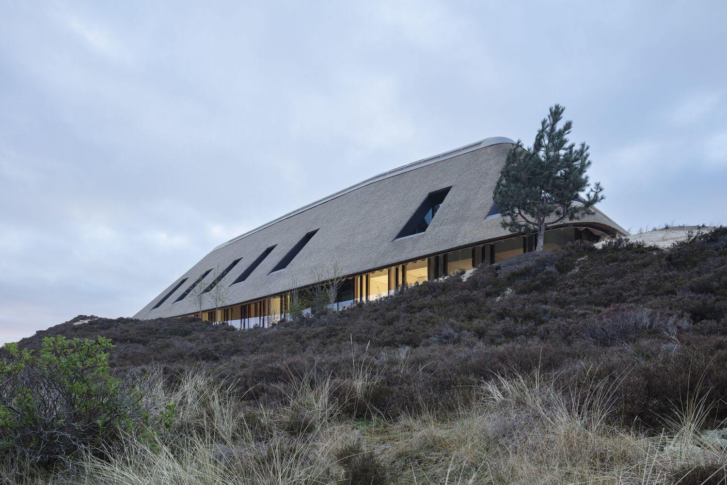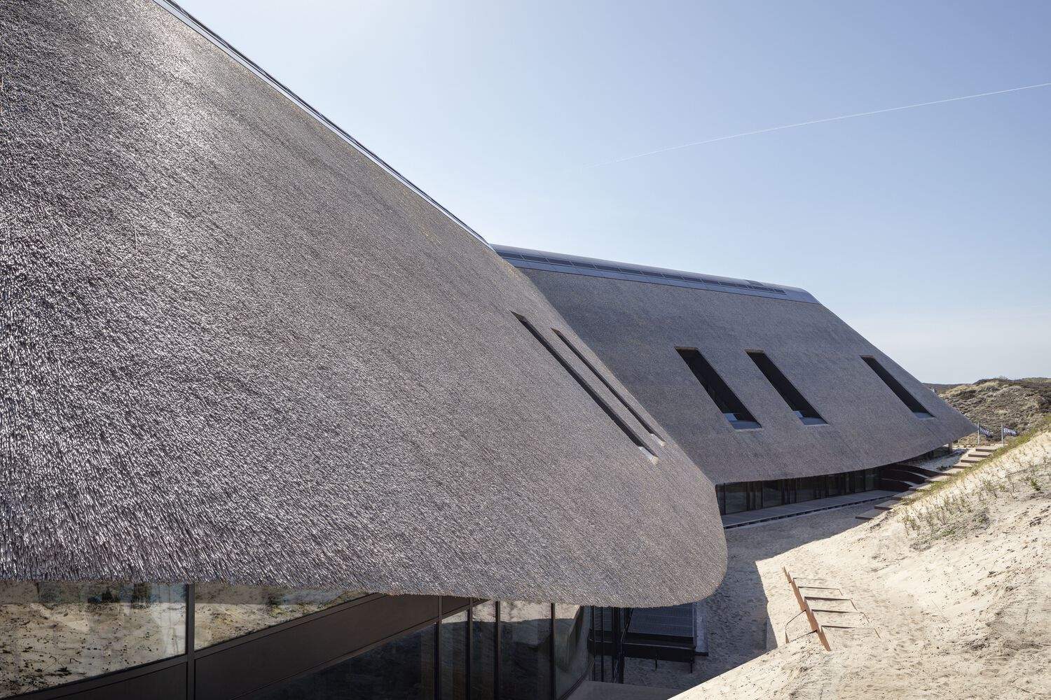 茅草屋顶的诗意:项目最引人注目的特征是其欧洲最大的茅草屋顶,面积达到7100平方米。这个巨大的屋顶不仅在视觉上给人以深刻的印象,更是对当地传统建筑风格的现代演绎。建筑师巧妙地将屋顶设计成低坡度,与周围的沙丘形态相呼应,使其仿佛是沙丘的延伸。屋顶的造型在远处看就像海浪一样,与周围环境和谐统一。这种设计语言既是对当地文化传统的尊重,也赋予了建筑独特的诗意和美学价值。茅草屋顶的应用也体现了对当地材料和工艺的尊重,同时也提供了良好的保温性能。