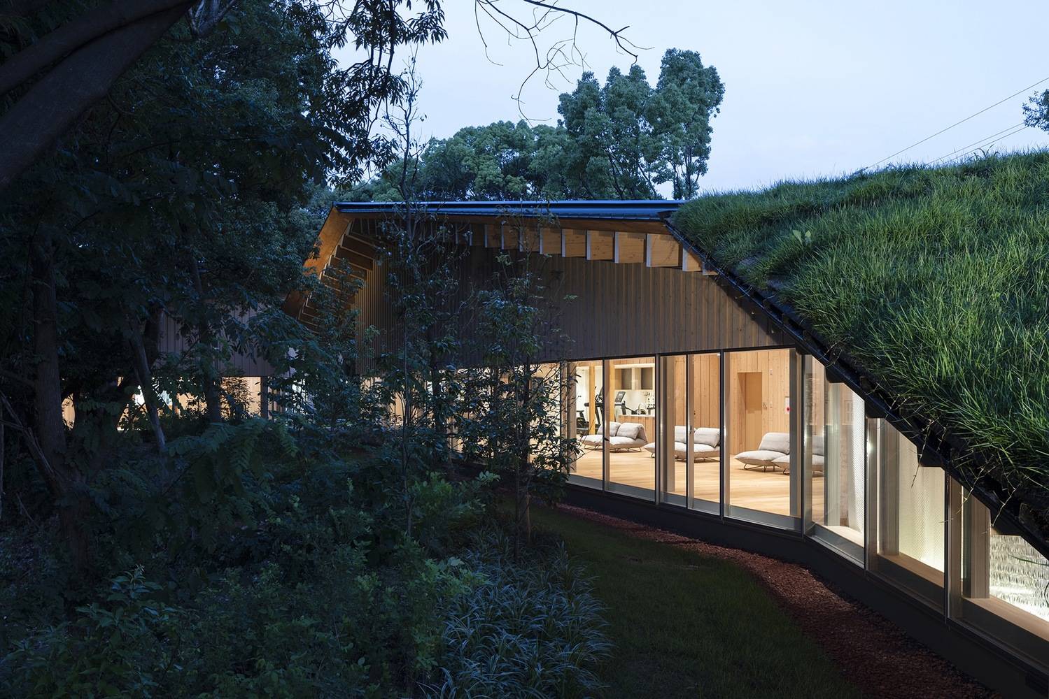 该建筑工地位于与 Kaneka 生产基地毗邻的一片荒芜的灌木丛中。设计目标是建造绿树环绕的建筑,尽可能多地保留现有树木。在对现有树木进行 3D 扫描以创建数据从而确定其位置后,砍伐了树木(主要是外来入侵树种),以保留适合该地区的树种。从地面延伸的多面体屋顶覆盖着建筑,使建筑与森林融为一体。