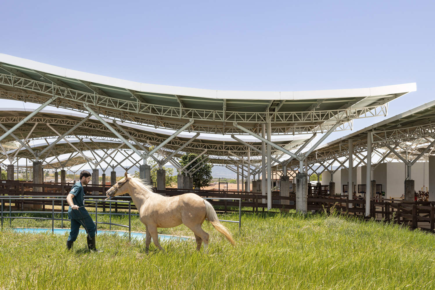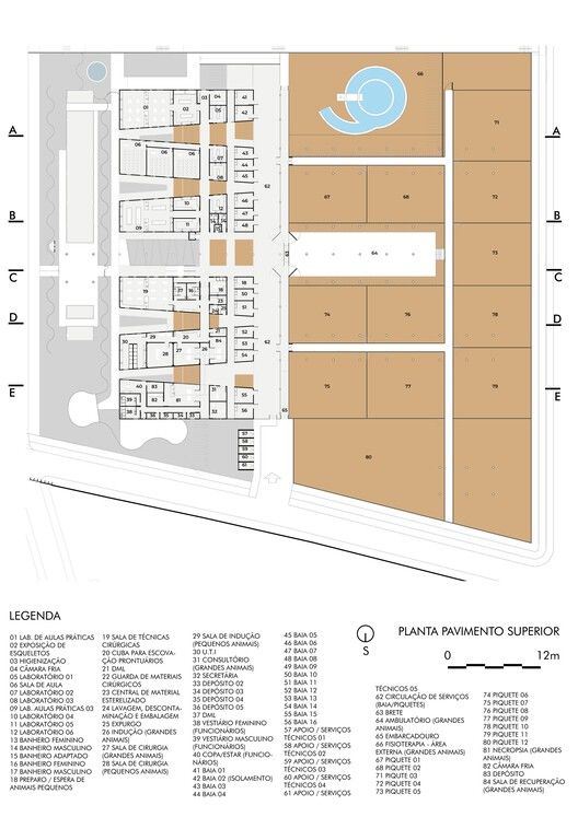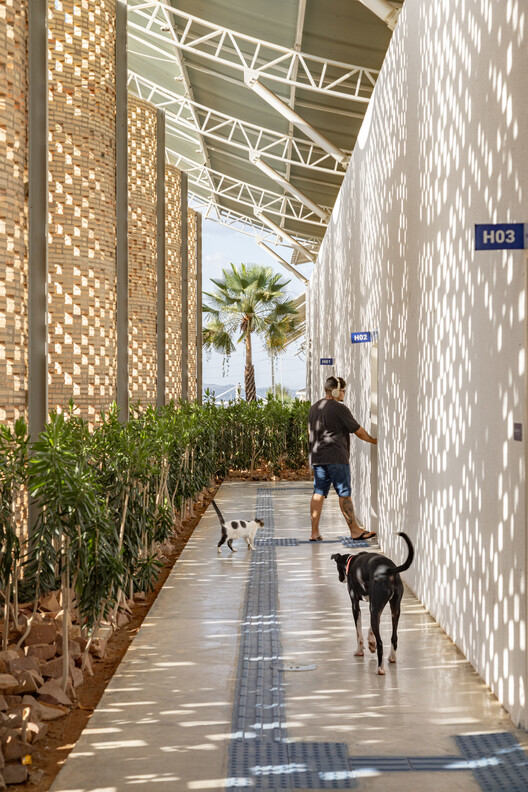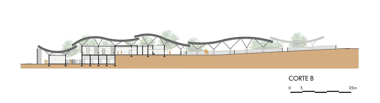 From the architect. The College of Veterinary Medicine at Unile ã o University is located in the city of Juazeiro do Norte, in the Cariri region of southern Cear á state. This is a veterinary school hospital where students can intern under the guidance of teachers. The hospital will provide services for both small and large animals, including small animal breeding areas (kennels and cat houses), large animal breeding areas, enclosures, consultation rooms, laboratories, surgical centers, classrooms, and administrative areas. The design concept of this project is to separate the large roof from the building and provide sufficient shading for the buildings below. This is the main strategy for achieving thermal comfort. The roof is supported by metal trusses, curved in shape like several waves, with interruptions in the middle to facilitate the release of hot air. Some areas are also covered with translucent polycarbonate tiles to utilize natural light. The large area of sun visors not only protects the building, but also the enclosure and the parking area for large animals.