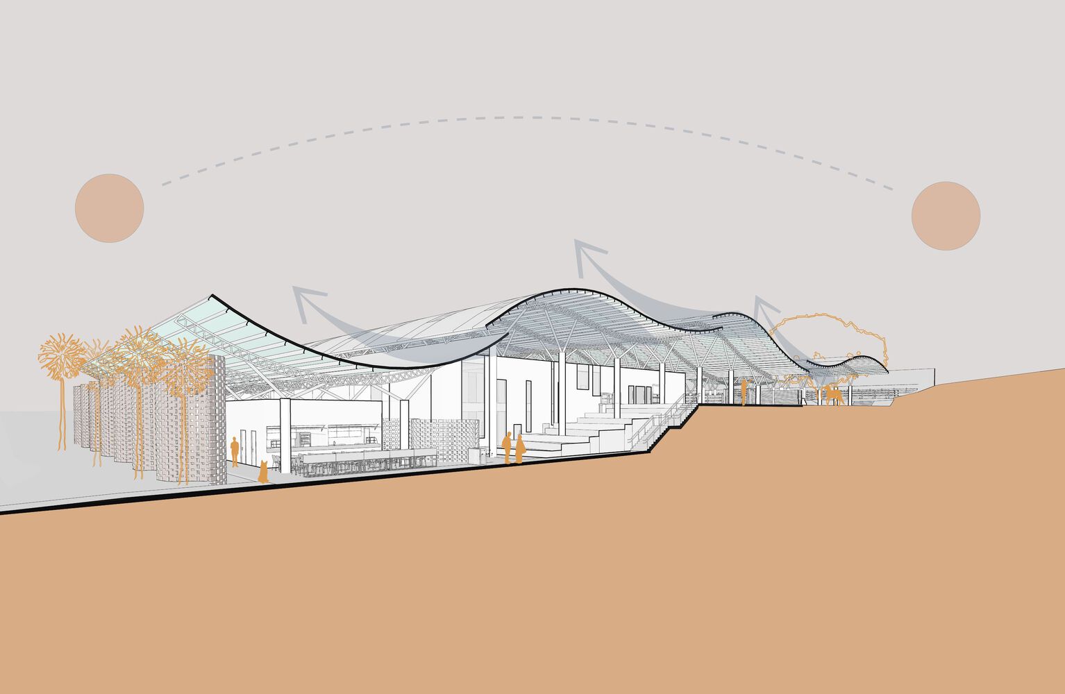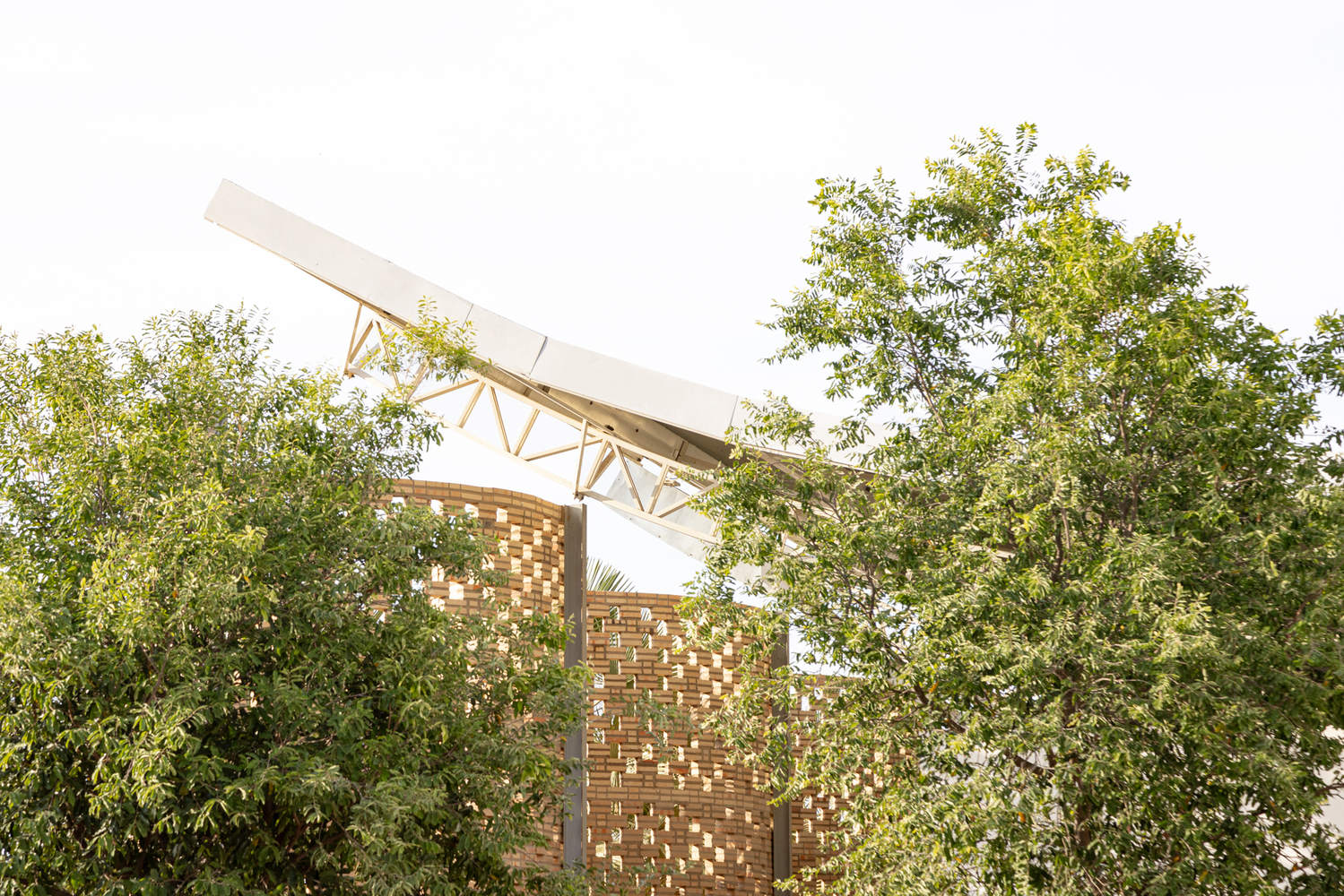 A seven meter high large sun visor made of solid ceramic bricks forms a grid like element that can filter out the strong sunlight in the area and protect the interior of the building. This type of masonry is snake shaped and is also used to separate public and private areas of buildings. Finally, the building aims to become an oasis in the desert, adopting a passive bioclimatic strategy to minimize the heat impact of semi-arid climate and provide spacious and comfortable space for the proposed activities.