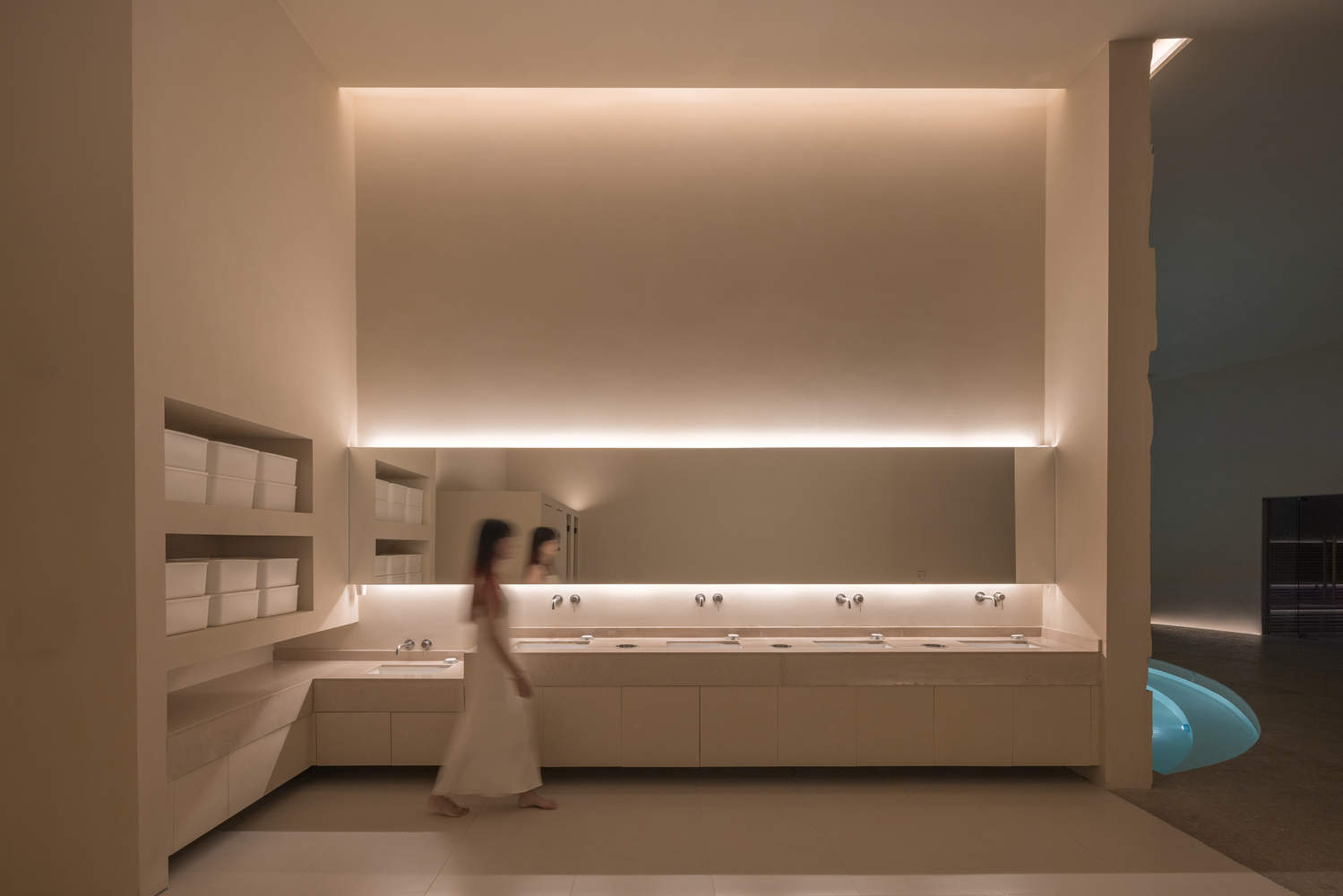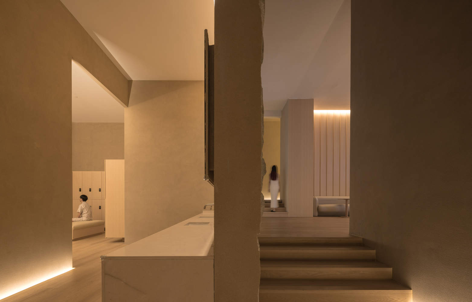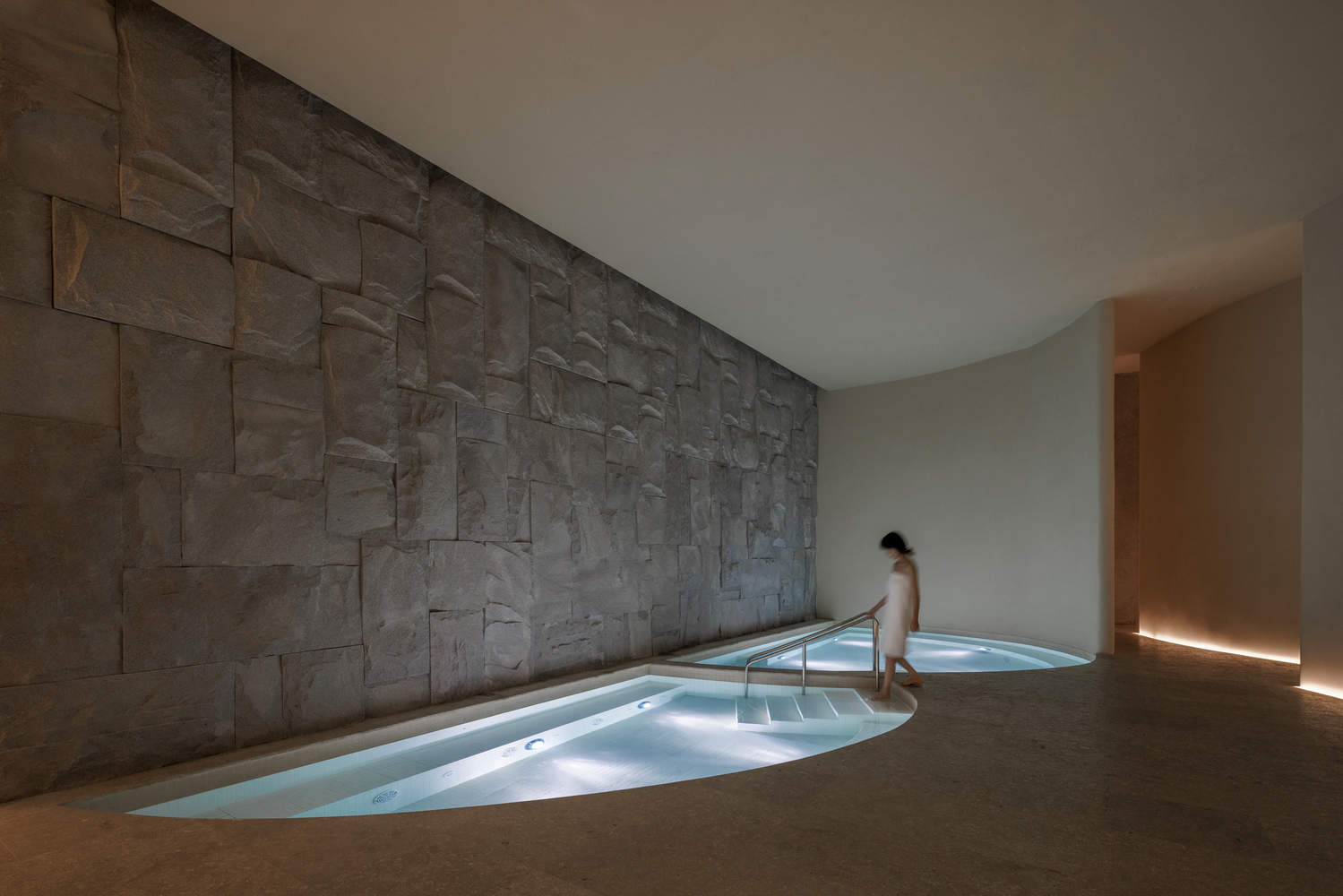 海纳百川,有容乃大,不只是水疗中心,这些变换无垠的空间也组成了承载情绪和感官的容器,材料、灯光、尺度在使用者的演绎下而富有戏剧性的变化,体现了物柔研究所对柔性空间的深刻理解与表达。