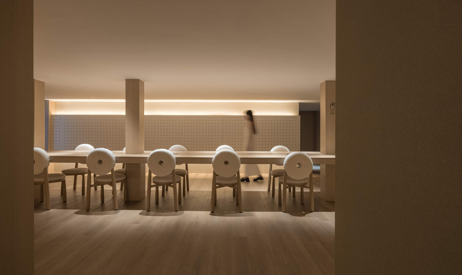At the end of the elevator hall exit, the light guides the line of sight to the cave like lazy sofa area. Soft partitions are made through slanted wooden walls, and the hollowed out parts make the wooden walls a screen fence. The entire space is endless and continuous, but each part has independence, allowing people to let go of the obstacles of "social fear" and choose between solitude and crowds with ease. At the same time, by reducing the lighting settings, the visual center of gravity is left in the lower space, creating a quiet and light artistic experience. The wrapped sofa, low lights, and dim yellow wood create a space full of security, making people calm and composed.