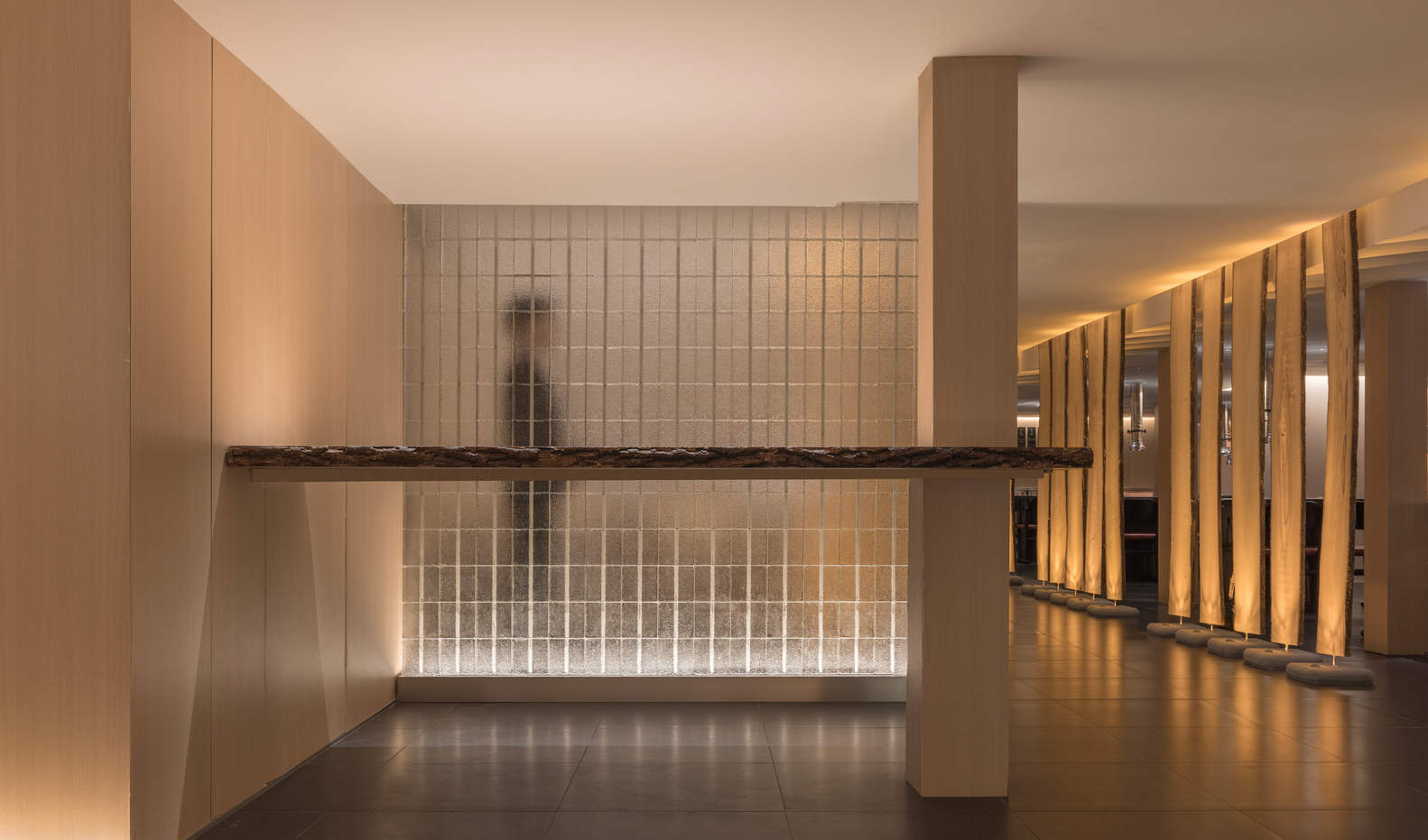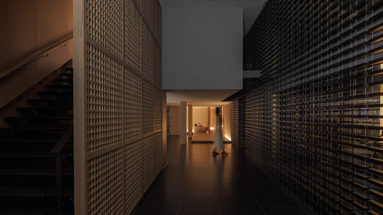 材质与光线的交响:项目的精髓在于对材质和光线的巧妙运用,它们共同构成了独特的感官体验。建筑师选择了木材、石材、金属砖、玻璃砖、马赛克和微水泥等多种材料,并精心搭配,在差异化的空间氛围里形成和谐统一的整体。光线的运用更是出神入化,通过降低灯光设置,创造出静谧轻灵的意境。例如,在休息大厅,玻璃与金属砖形成的围合结构,营造出通透的隐私空间,而卧躺其间,光影明暗交错,宛如置身影幕之中。这些细致入微的设计,共同构建了一个既有安全感,又充满艺术氛围的疗愈空间,让使用者在其中放松身心,沉浸于感官的享受。