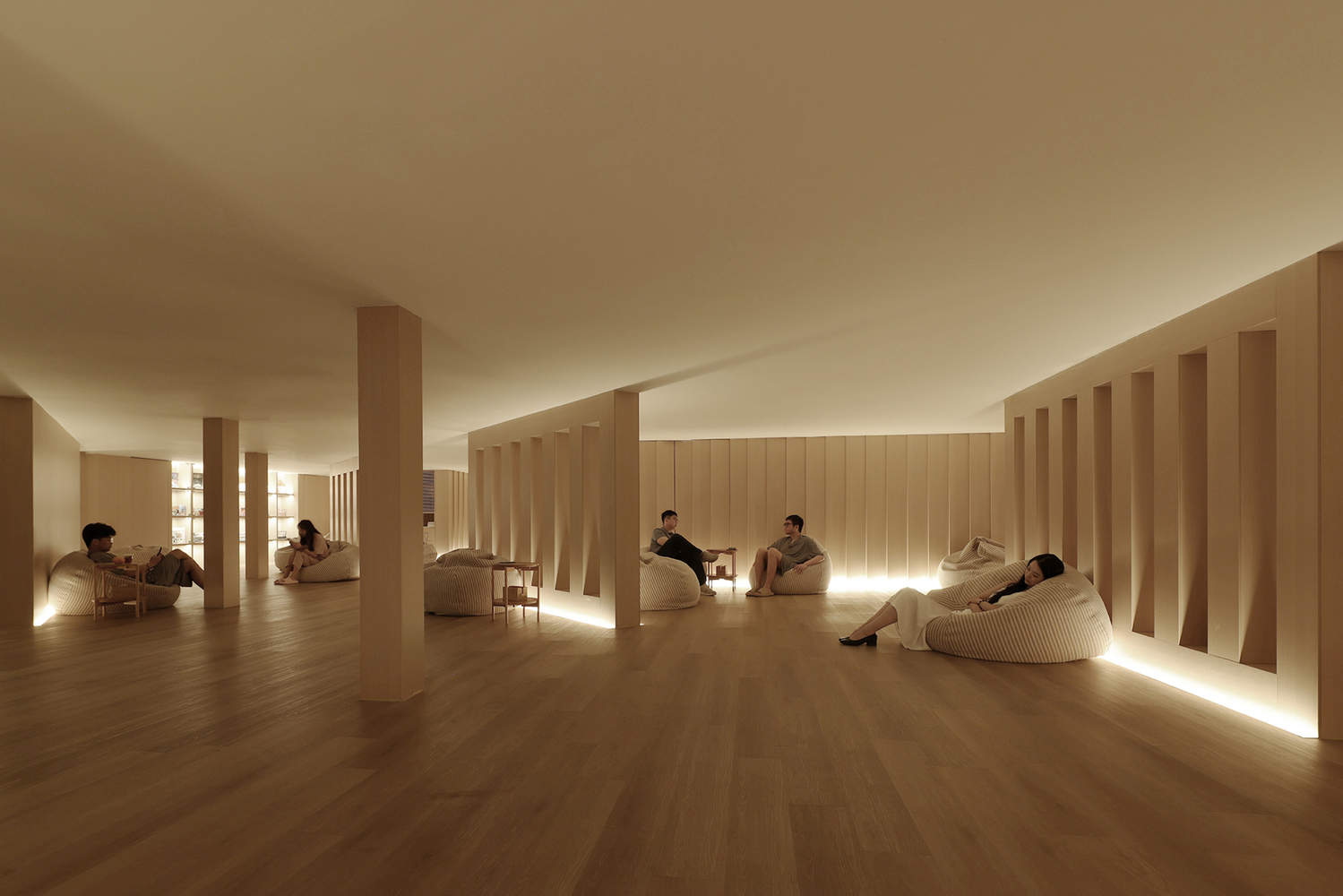 电梯厅出口的尽头,光线引导视线至洞穴般的懒人沙发区,通过斜列的木墙做了软性分割,镂空的部分让木墙成为屏风栅栏,整个空间无尽连续,但每个局部又具有独立性,让人放下“社交恐惧”的障碍,在独处与众聚的选择游刃有余。同时,通过降低灯光的设置,将视觉重心留在低处空间,塑造静谧轻灵的意境体验。包裹的沙发、低矮的灯光、昏黄的木色,形成了一种富有安全感的空间,令人沉心静气。