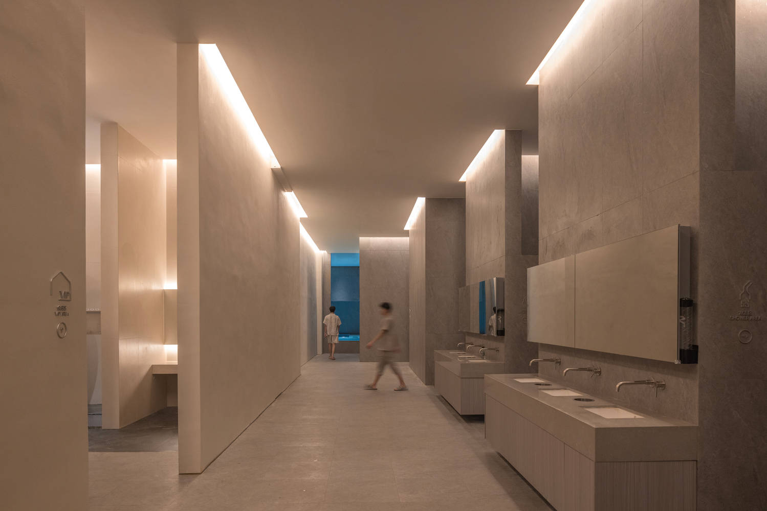 五层的水疗区,从大厅分出男女宾区,经过精巧的更衣室和淋浴间,步入泡池区域。女宾区偏柔软,半圆形的水池在白麻石前截断,仿佛立于山岩之下,置身于泉涌之间;男宾区则爽朗,从洗漱空间可以窥见尽头的蔚蓝,空间中漫反射形成的蓝色预告水的事件发生,方形泡池又连接着另外一端温热的桑拿区,其色温设置也富有昭示性,让人仿佛游走在冰川与火焰之间。两处通过尽头的楼梯隧道拾级而下,重新交织,一起从晦暗的指引中,抵达明亮的水吧。