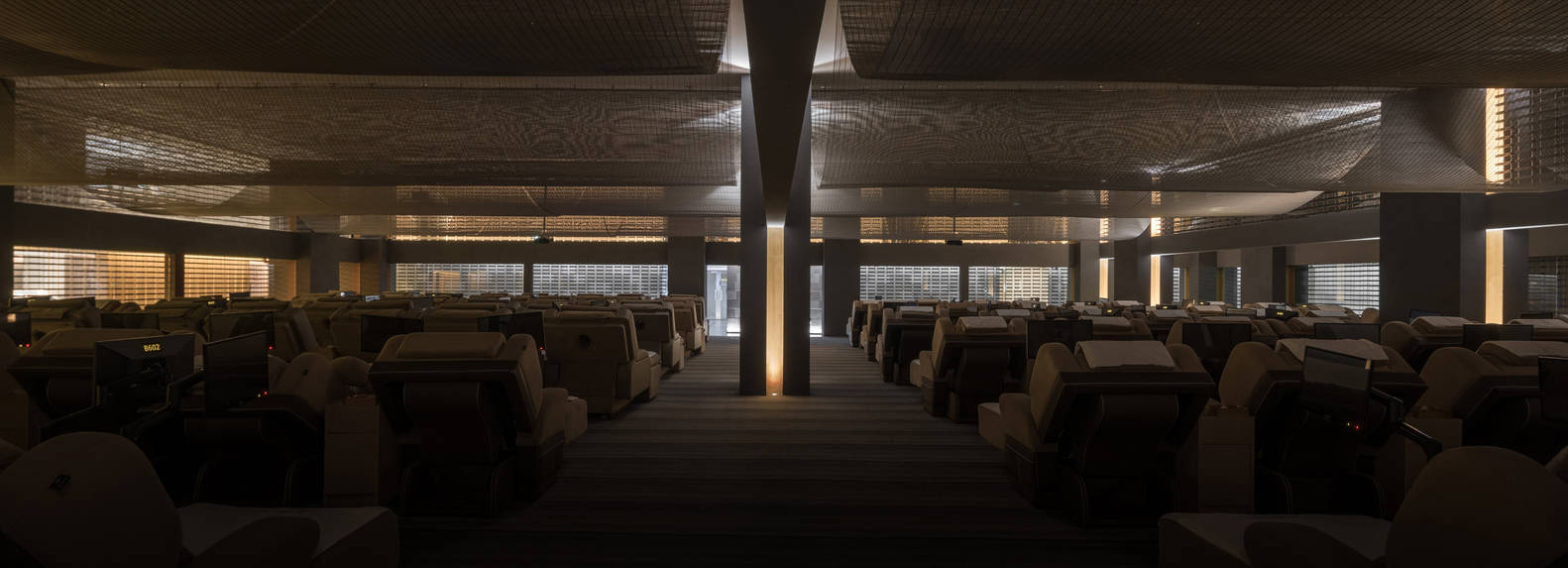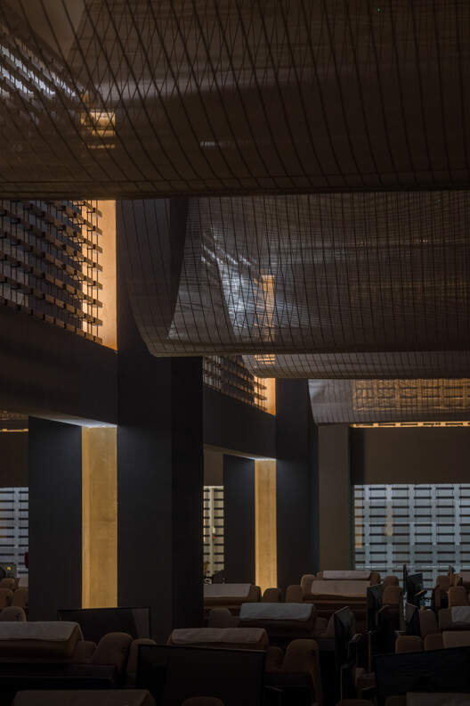 休息大厅位于四层中央区域,四周回廊采用玻璃与串联的金属砖作为围合材料,内外形成两道屏障,既隔绝声音干扰,又形成具有通透性的隐私空间,卧躺大厅,明暗有别,仿佛置身于影幕之中,阑珊灯火中,上映缓缓的人影流连。金属砖尺度接近青砖的排列,既平易近人,又耳目一新,构成了整个场所中最大面积的视觉记忆。