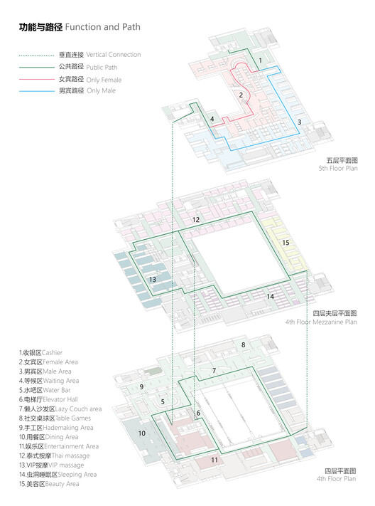 情感与功能的融合:“深圳熹汤水疗中心”最令人称道的,是它将情感体验与功能需求完美融合。项目不仅是水疗中心,更是一个承载情绪和感官的容器。从男女宾区的划分、泡池的独特设计,到懒人沙发区和餐厅的布局,每一个细节都体现了对使用者情感需求的深刻理解。建筑师在设计中充分考虑了隐私性、舒适度、互动性,以及对不同人群的关照。这种以人为本的设计理念,使得空间充满了活力和情感,让使用者在其中能够找到心灵的共鸣,获得身心的双重放松。这种情感与功能的完美结合,是项目成功的关键,也是其值得学习的精髓所在。