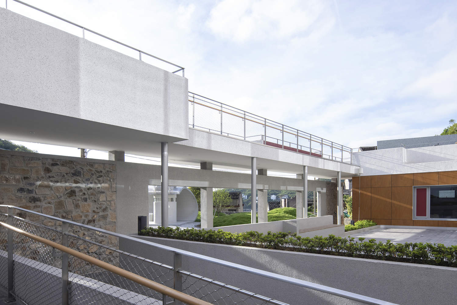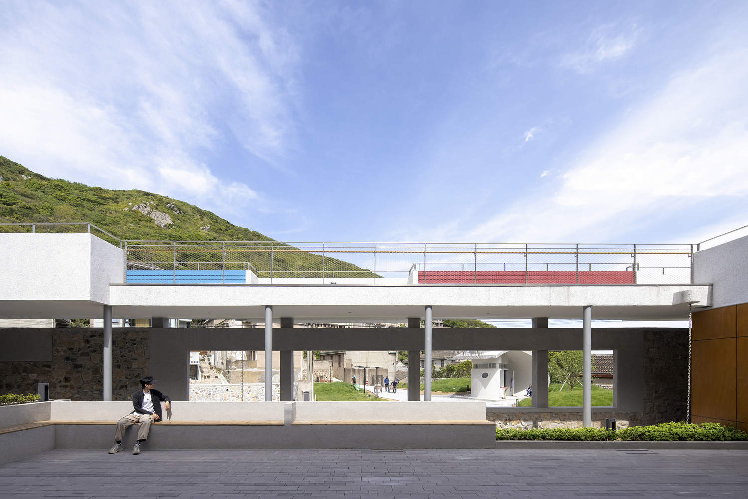 红与蓝这两种拥有小岛居民立面印记的色彩被用于卧室外立面和窗台上,也以彩漆木板的形式穿插于交通空间和户外坡道上。建筑主体材料为水洗石涂料,入口围墙使用毛石,连廊采用钢柱,形成轻重对比,呼应在地建筑氛围。