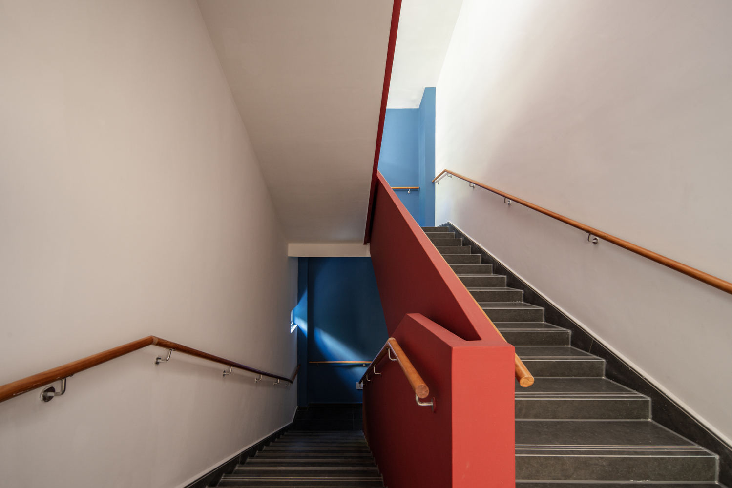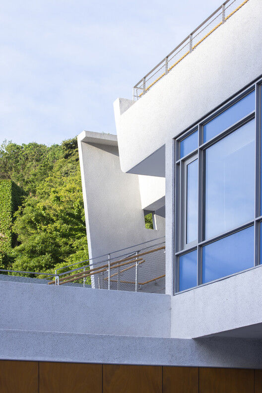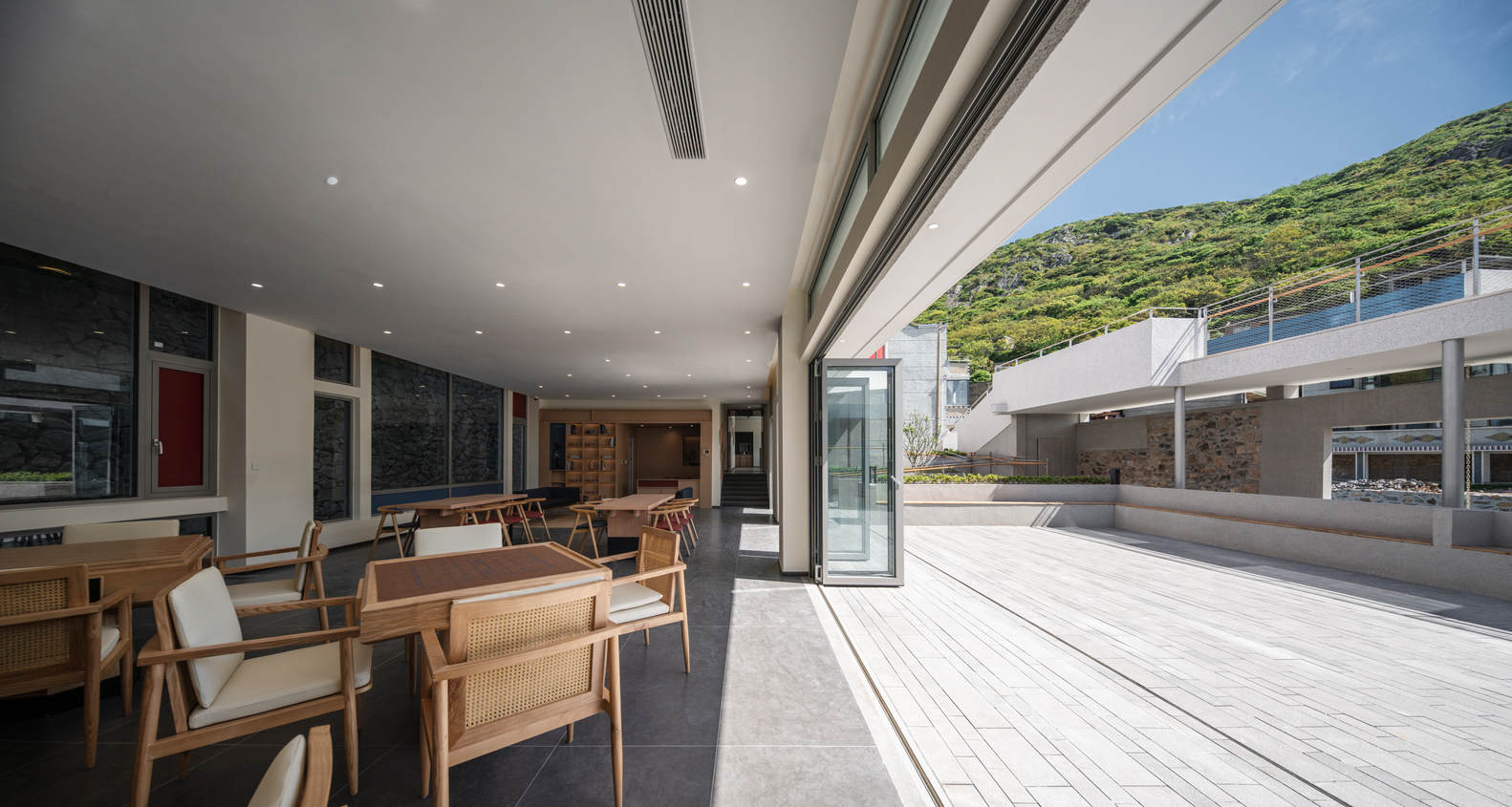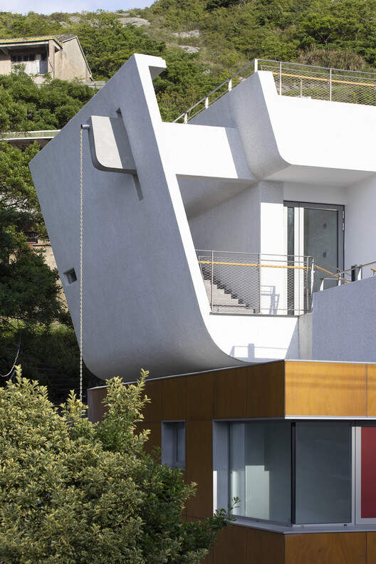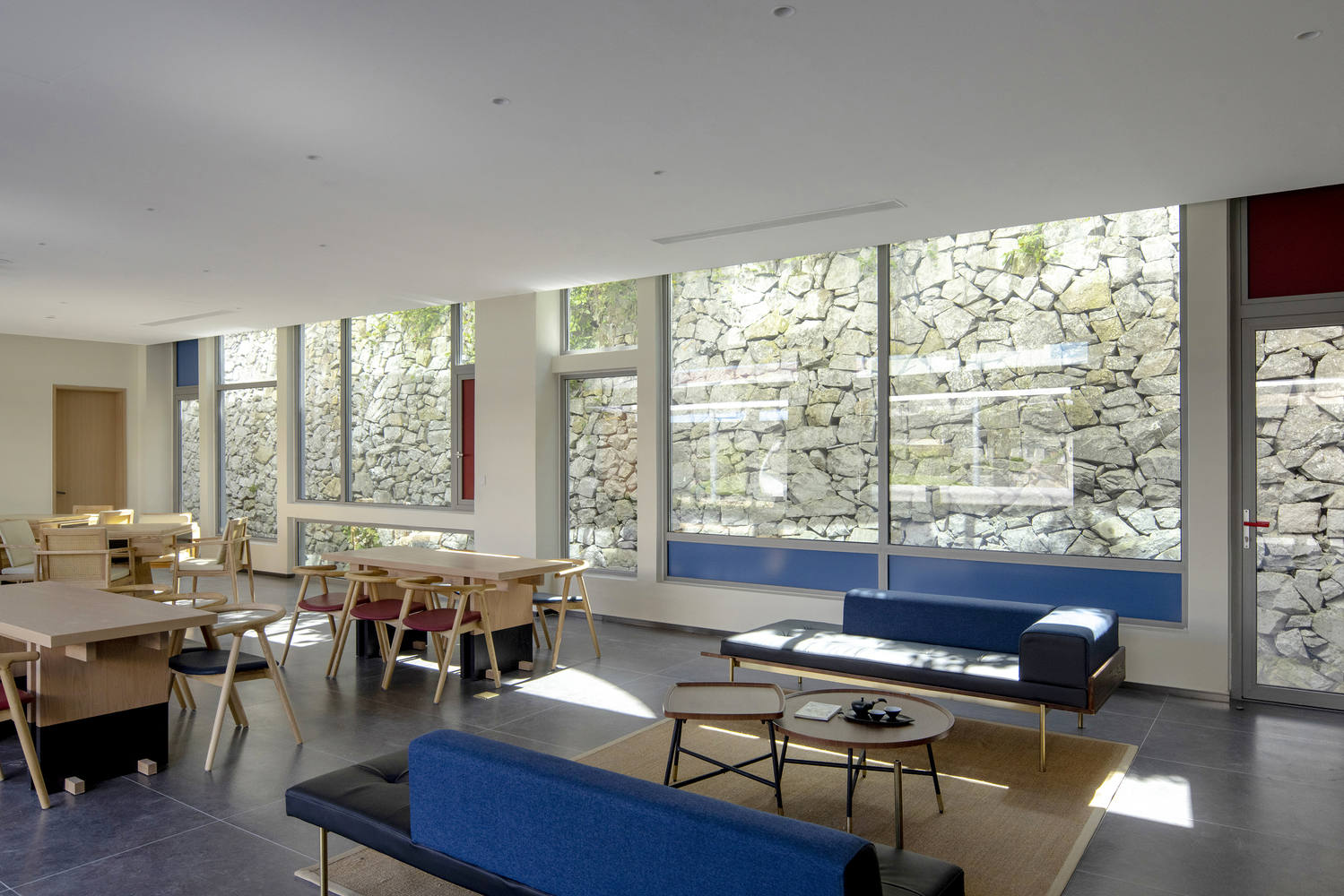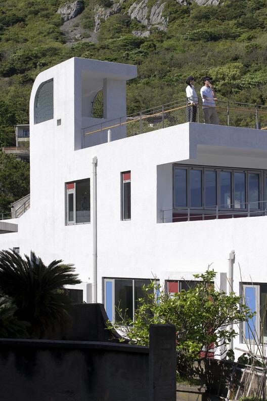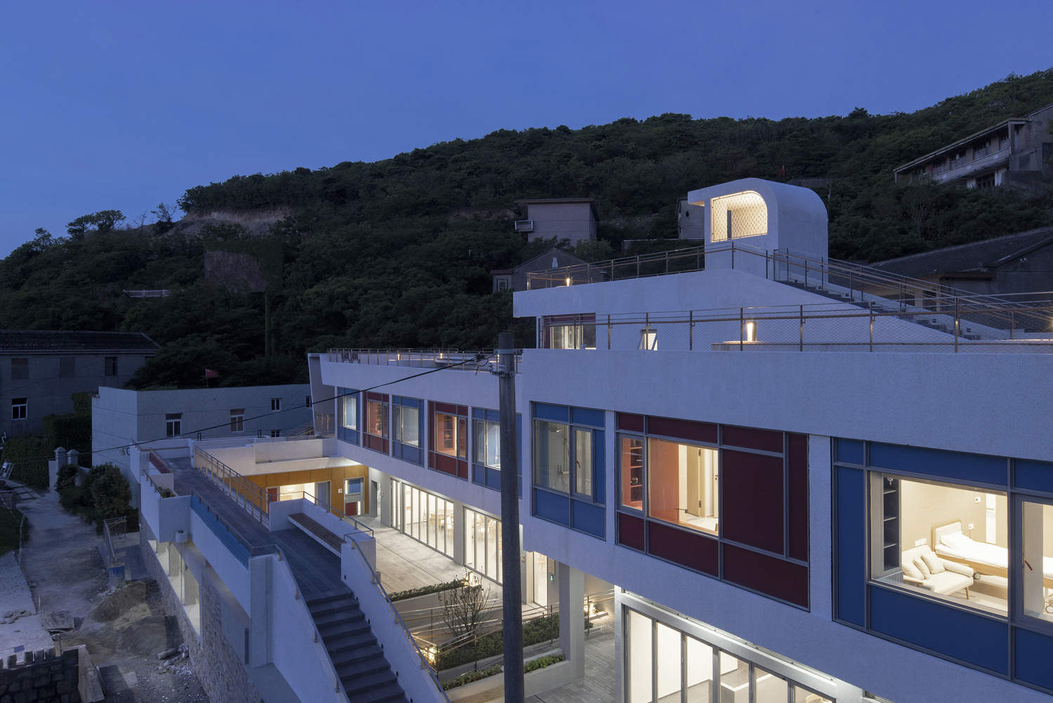 The two colors of red and blue, which have the imprint of the island residents' facades, are used on the bedroom facades and windowsills, and are also interspersed in the form of painted wooden boards in traffic spaces and outdoor ramps. The main building material is washed stone paint, the entrance wall is made of rough stone, and the corridor is made of steel columns, creating a contrast between light and heavy, echoing the local architectural atmosphere.