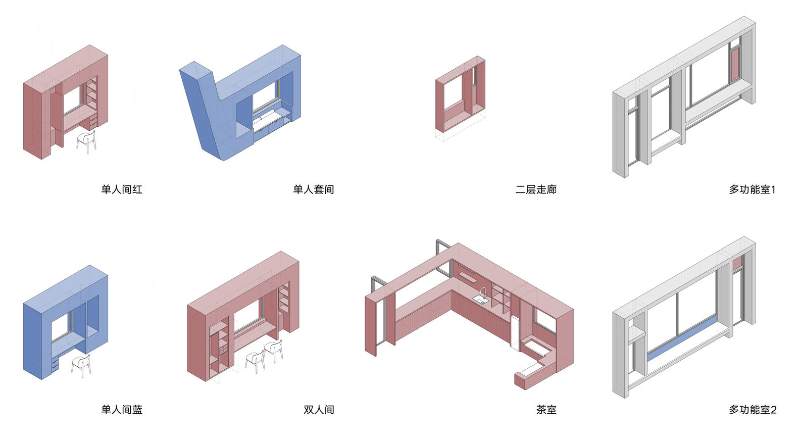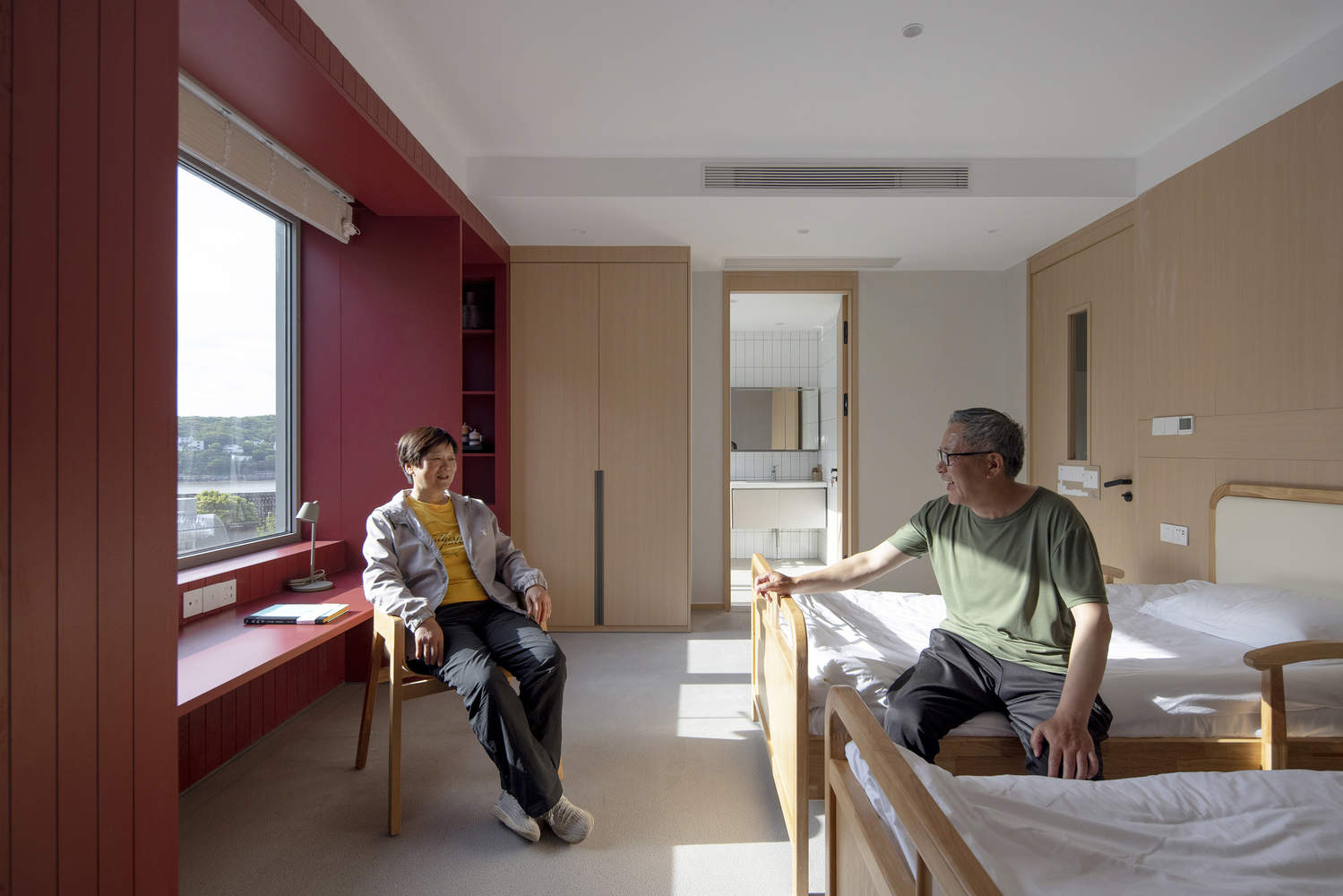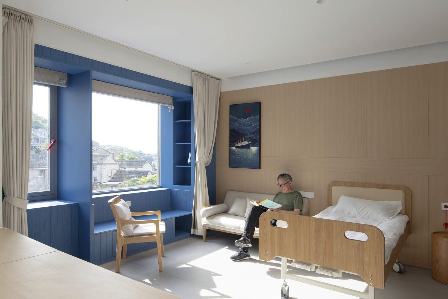 设计理念的巧妙运用:该项目最令人印象深刻的亮点在于其设计理念的深刻性和与当地文化的紧密结合。建筑师从柴山岛渔民的渔船中汲取灵感,将托老所的外形设计成一艘“漂浮”于海岛上的船只。这种设计不仅是对当地渔民生活方式和情感记忆的尊重和延续,更是赋予了建筑独特的象征意义,唤醒了老人们对过去美好时光的回忆。同时,建筑师巧妙地运用红蓝两色,这两种颜色源自岛上居民的建筑立面,将这些色彩融入卧室外立面和窗台,进一步强化了建筑与当地文化的联系,使得建筑不仅仅是居住空间,更是承载着岛民集体记忆的载体,体现了建筑设计的人文关怀和对地方文脉的尊重。