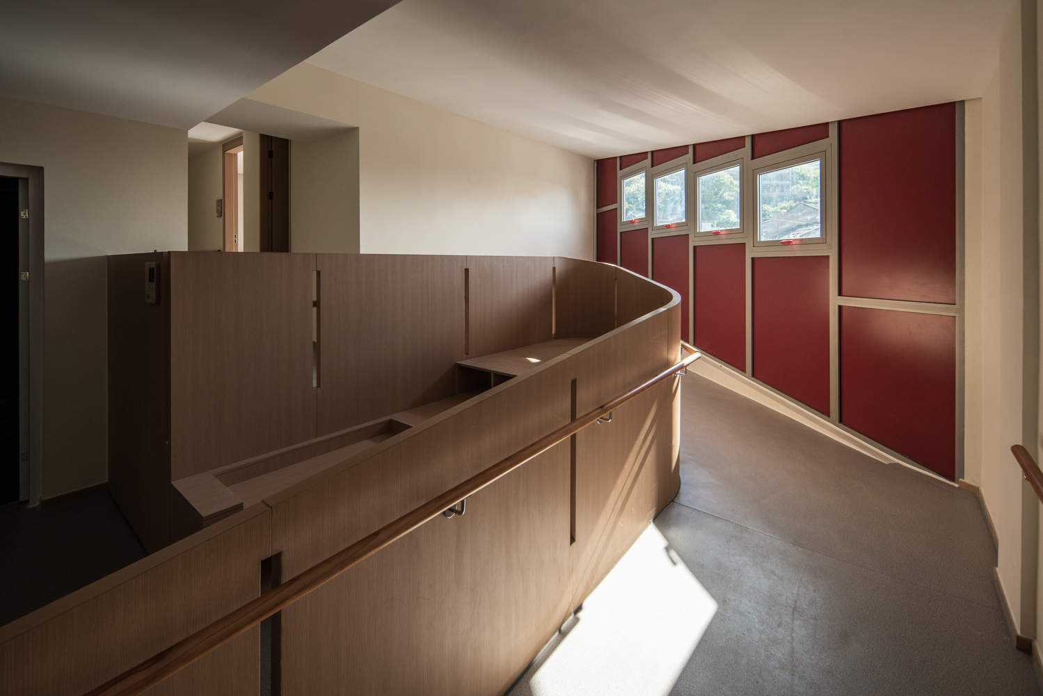 空间重塑与功能优化:项目在空间重塑与功能优化方面展现了卓越的专业能力。针对原有场地存在的问题,例如公共区域狭窄、光照不足等,建筑师进行了全面的改造。通过增加多层屋顶露台,利用坡道连接首层院落与露台,极大地扩展了户外活动空间,满足了老年人对社交和活动的需求。同时,建筑师还对室内空间进行了重新规划,将走廊和楼梯移至背阴面,将向阳面留给老人居住,从而改善了采光、通风和视野条件。更值得称道的是,项目充分考虑了适老化设计细节,例如改造楼梯、配置电梯、增加扶手和无障碍通道等,切实提升了建筑的安全性、便利性和舒适性,体现了对老年人生活需求的细致关怀。