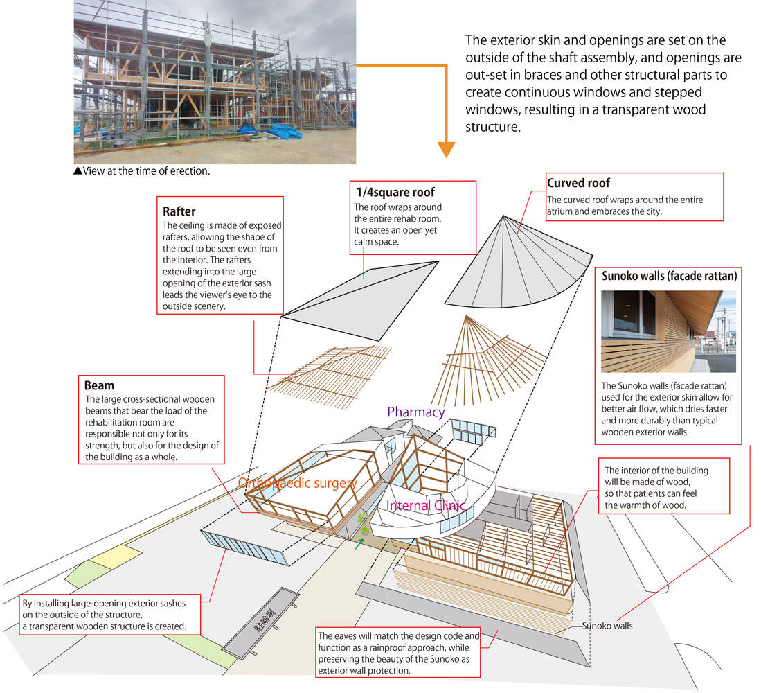 Sunoko walls used for exterior facades can better promote air circulation, drying faster and more durable than ordinary wooden exterior walls. The goal of the design is to create a building with a bright and warm wooden feel, presenting the wooden frame as the internal structure. Therefore, the design team verified the structural stability and colleagues ensured its visual appearance.
