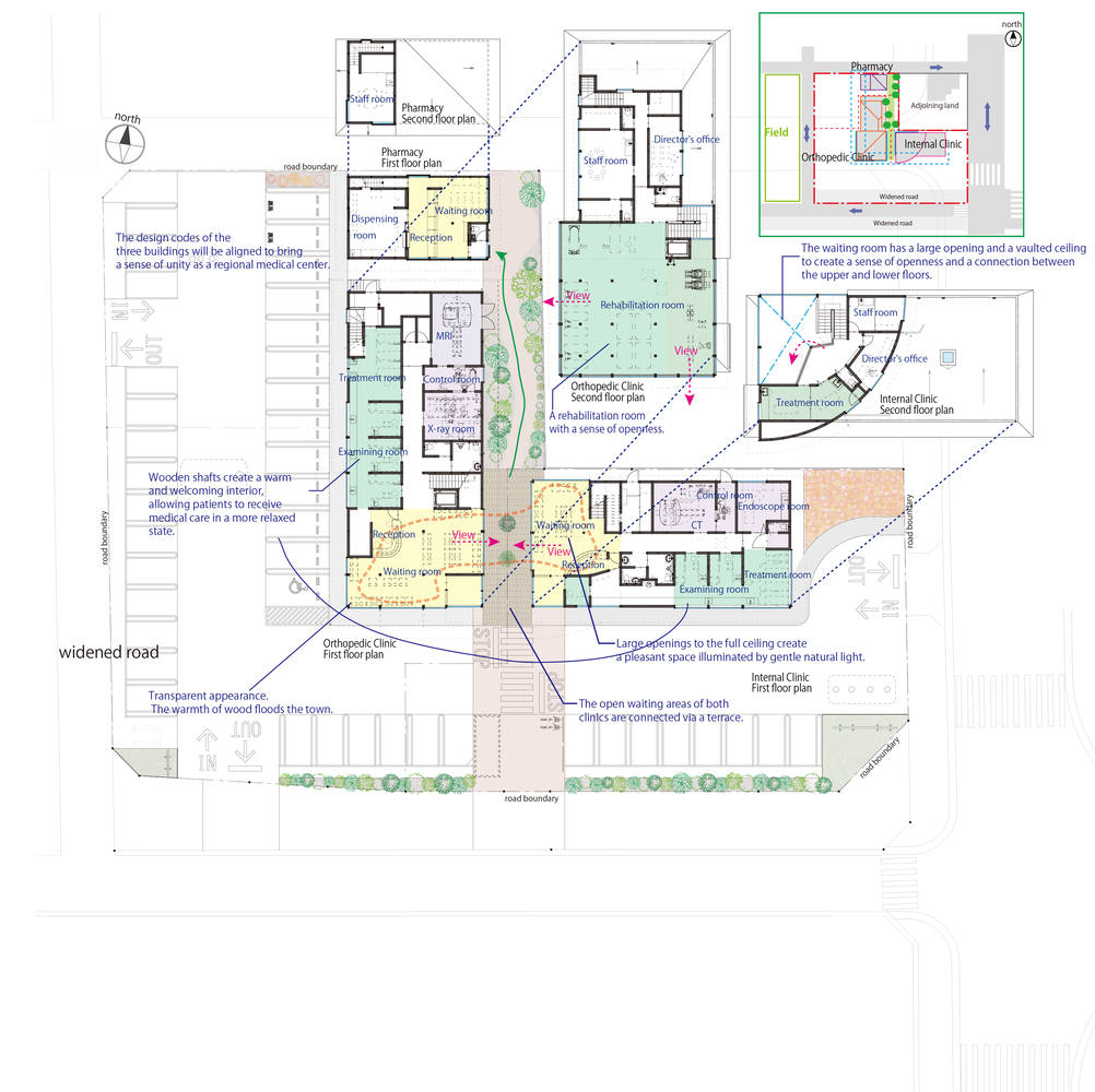 客户希望建立一个内科、骨科诊所及药房,并希望设计符合规范并拥有明亮的氛围。场地位于连接市中心的主干道沿线,南侧有一条城市规划道路预计将被拓宽,未来发展可期。