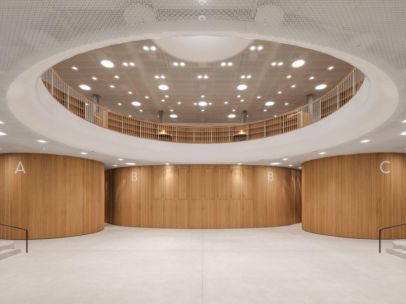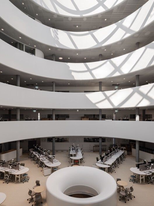 Research and Teaching Facilities- Within this cylindrical white building, research and teaching facilities are arranged around a central atrium, encouraging communication and collaboration among researchers. A teaching square unfolds below the atrium, directly echoing the surrounding landscape. Three lecture halls are built in accordance with the natural terrain slope. Natural light pours in from the outside, and thanks to movable partition walls, the lecture hall, lobby, and caf é can be reassembled into a large space. This creates a square with a central stage that can be used for special events and can accommodate 670 spectators. The gallery upstairs has open student workstations. The adjacent seminar rooms on the same floor have improved the available space for university teaching. On the fifth floor, there are research laboratories, diagnostic rooms, and supporting offices, providing a panoramic view of the surrounding scenery. Open workstations have been arranged around the atrium for the use of doctoral students and laboratory staff. From these workstations, one can simultaneously see multiple floors and the square below, which is connected to the atrium above through small circular holes (i.e. skylights) in the ceiling.