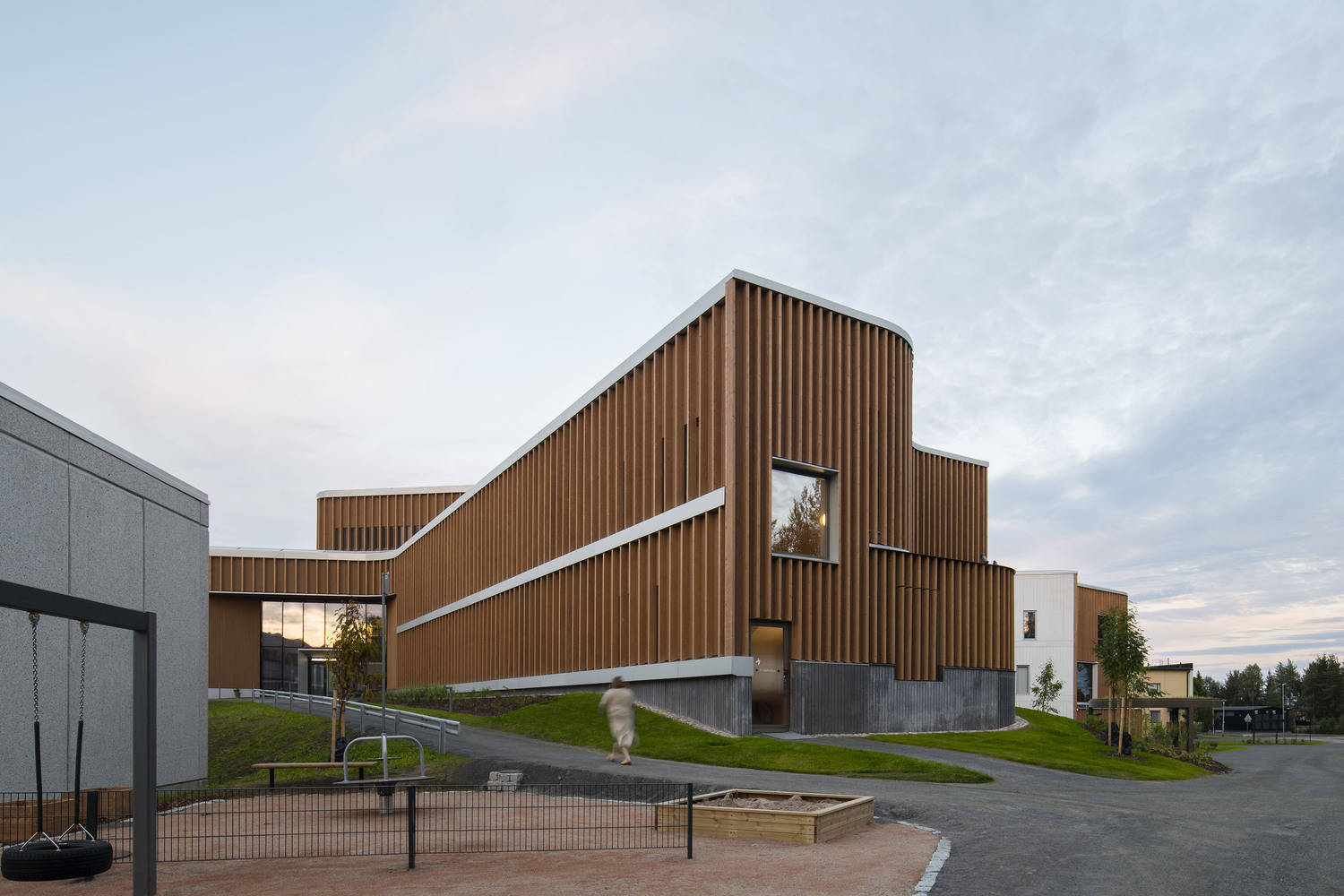 医院校园的修订布局基于创建一个新的东西向内部连接,作为该计划的空间和功能统一骨干。 该建筑传达了人道主义和以患者为中心的护理,同时唤起了人们对拉普兰大自然的印象。 材料、空间解决方案和自然光创造了一个安全、治愈的环境,既为患者提供有效的治疗,也为员工的健康服务。 医院院区实施的公共艺术品使周围环境变得生机勃勃,促进了病人的康复。