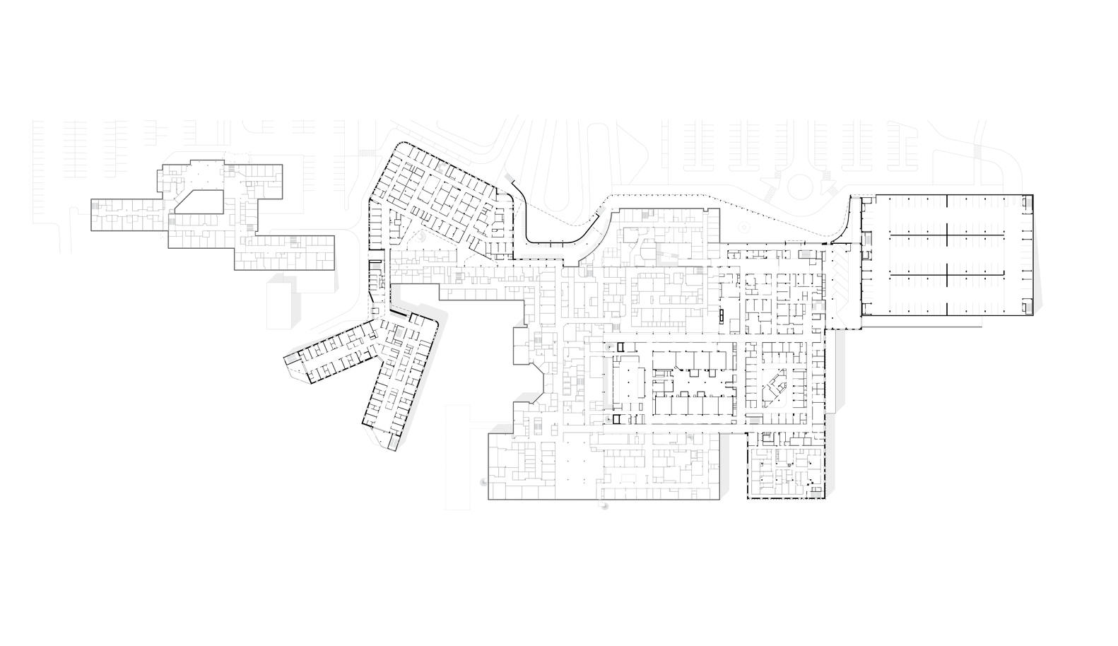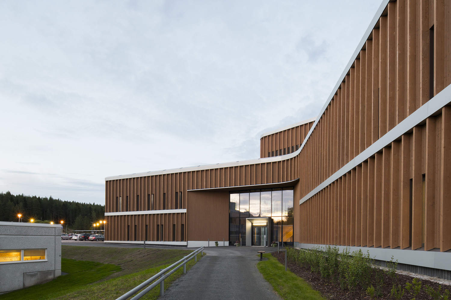 新建的医院和停车楼位于现有医院的东侧。 入口雨棚和内部木制表面营造出温馨而迷人的氛围。 精神病院位于中心医院大楼的西侧。 它的病房和室外院子位于一片小森林旁边,将大自然引入治疗过程。 患者是中心,良好的客户体验、安全、有效的治疗和员工的福祉是关键目标。