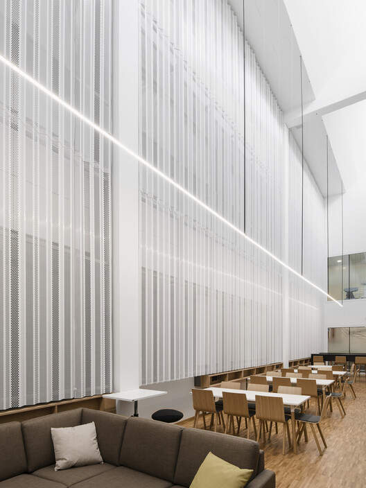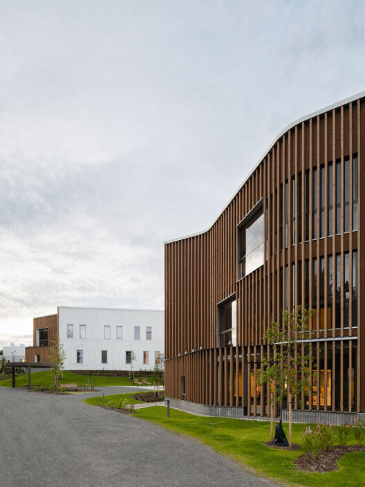 新建筑的建筑风格是一致的,可识别的。 精神病医院的主要立面材料是半透明的木材,而医院的立面则以白色混凝土和铝材为特色。 垂直薄板和地面悬挑结构提供天气保护,减少机械冷却的需要。 模块化立面解决方案允许沿立面灵活放置各种尺寸的空间,从而支持内部的适应性。