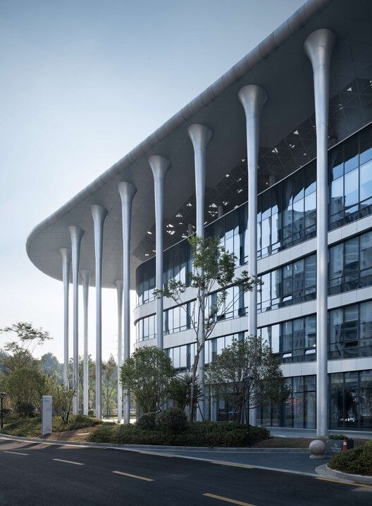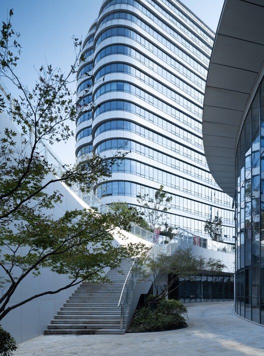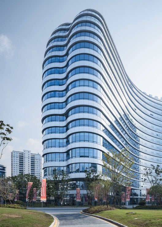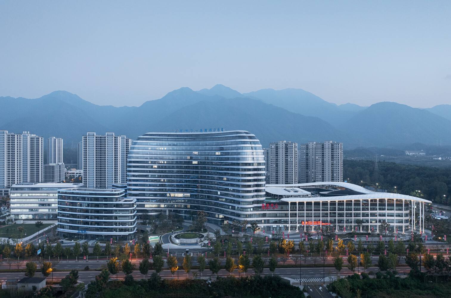 Visually, starting from the high and bright outpatient hall, the spacious and column free medical main street connects various outpatient modules and medical technology functions, reaching the inpatient elevator hall surrounded by multiple elevators and connecting to the inpatient lobby. In practical use, patients can see the division and orientation of outpatient and various medical technology functions in the spacious medical street indoors, and can clearly identify the direction and easily reach them. The leaf shaped integrated main building, in order to continue the continuous landscape atmosphere of the Fuchun Mountain Residence, outlines the end and skyline with micro curves. The administrative and infection buildings on both sides are surrounded by the comprehensive building, reflecting the undulations of the distant mountains. The combination of silver gradient aluminum panels and blue grey glass presents a subtle dialogue between the past and the future in terms of time and space.
