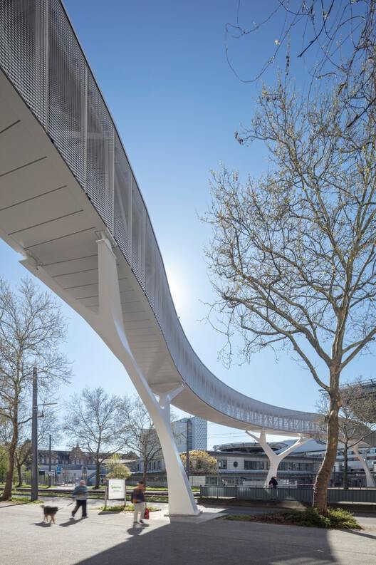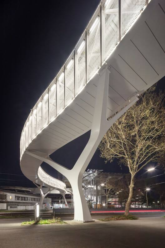 这座 80 米长的曲线天桥以柔和弧度跨越弗朗茨-卢斯特街(Franz-Lust-Strasse)的四车道及中央有轨电车轨道。街道两侧采用分叉式立柱设计,宽幅悬臂与悬铃木行道树融为一体;停机坪前方增设独立支柱。