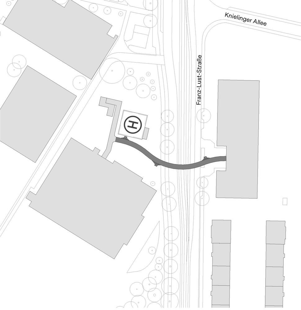 卡尔斯鲁厄市立医院计划新建直升机停机坪,并构建连接停机坪、医院本部及马路对面赫利奥斯诊所(Helios Clinic)的跨路天桥。2020 年,该院与沃纳·索贝克(Werner Sobek)事务所联合参与桥梁设计竞赛,凭借美学设计与高度功能性脱颖而出。