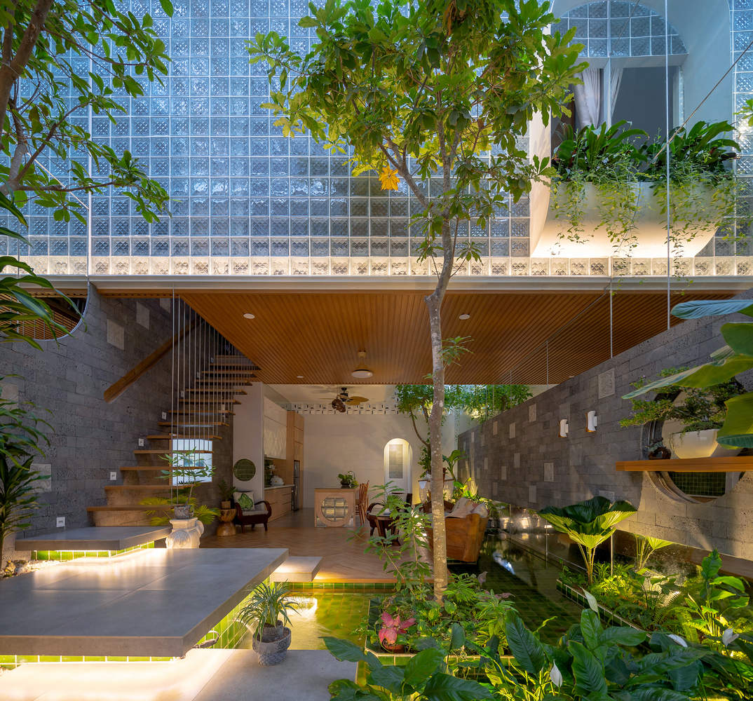 材料语言与设计创新:该项目在材料运用方面也极具特色。玻璃砖的应用不仅限于空间拓展,其波浪图案的设计灵感来源于越南西部的海域,赋予了建筑独特的地域特色。同时,建筑师巧妙地运用“空间借用”的手法,将客厅和厨房融为一体,增加了空间的灵活性和互动性。这种设计不仅提升了住宅的功能性,也体现了建筑师对现代生活方式的理解。此外,散落在玻璃屋顶上的鹅卵石,不仅能起到光线调节的作用,也为室内营造了一种温馨、舒适的氛围。整个项目体现了建筑师对材料的深刻理解和对设计的创新精神,将材料的特性发挥得淋漓尽致。
