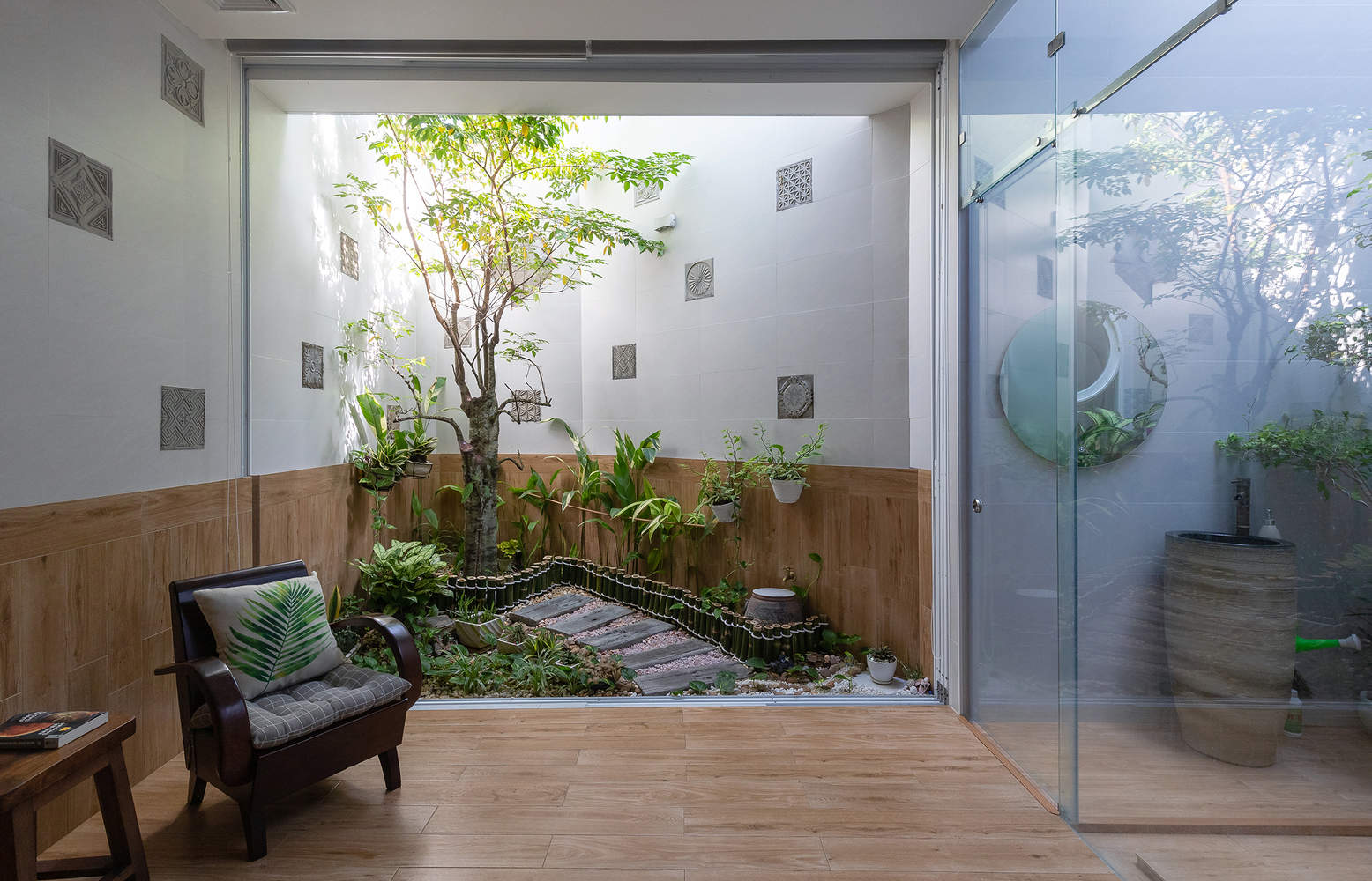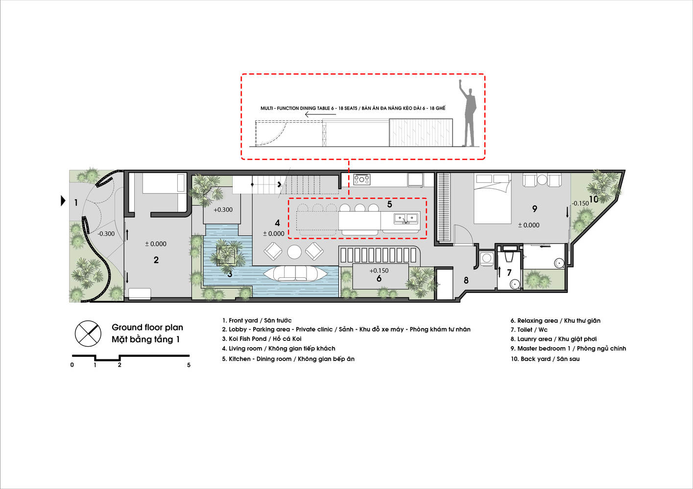 将鱼塘和花园融入生活共居空间:建筑师意识到需要在狭窄的空间中满足业主对于种植和养鱼爱好的大面积需求,因此将这些区域进行整合,创造了一个生活共居空间。鱼塘不仅提供了景观元素,还调节了生活空间的小气候。