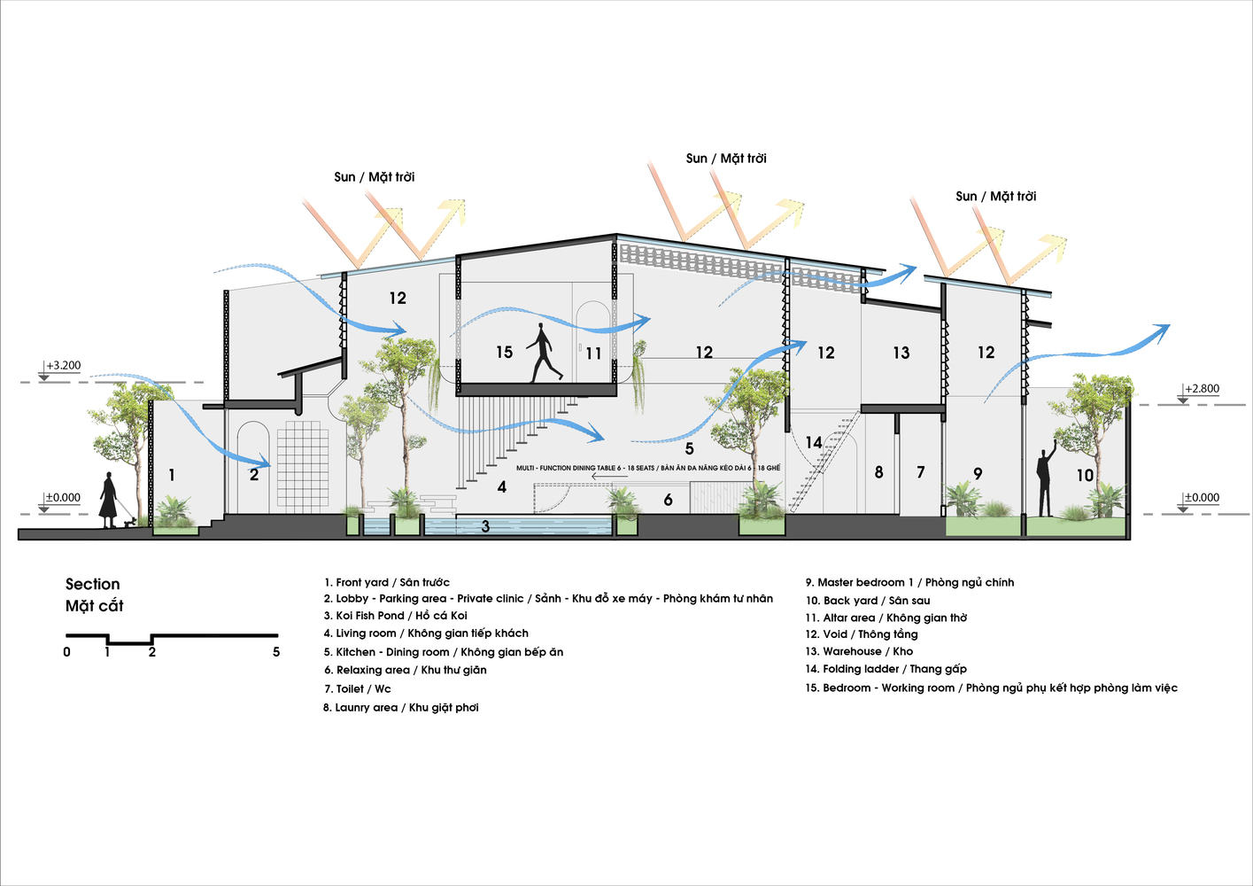 功能整合与微气候调节:除了空间感的营造,该项目在功能整合和微气候调节方面也展现出卓越的设计智慧。建筑师将业主对种植和养鱼的需求融入到住宅设计中,通过鱼塘和花园的结合,创造了一个共享的、充满生机的居住空间。更重要的是,这些设计不仅仅是为了美观,还具备实际的调节功能,如鱼塘可以调节微气候,降低室内温度。此外,项目中对通风砖的运用也体现了对环境的关注,通过精心设计的通风系统,保证了室内空气的流通,并兼顾了排水功能。这些细节都体现了设计师在满足居住需求的同时,对可持续性设计的思考。
