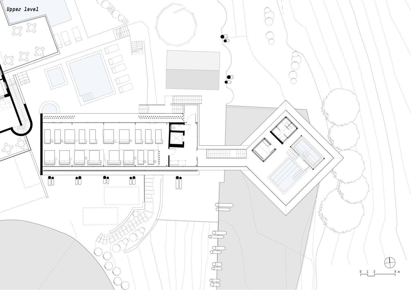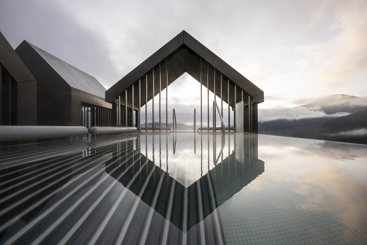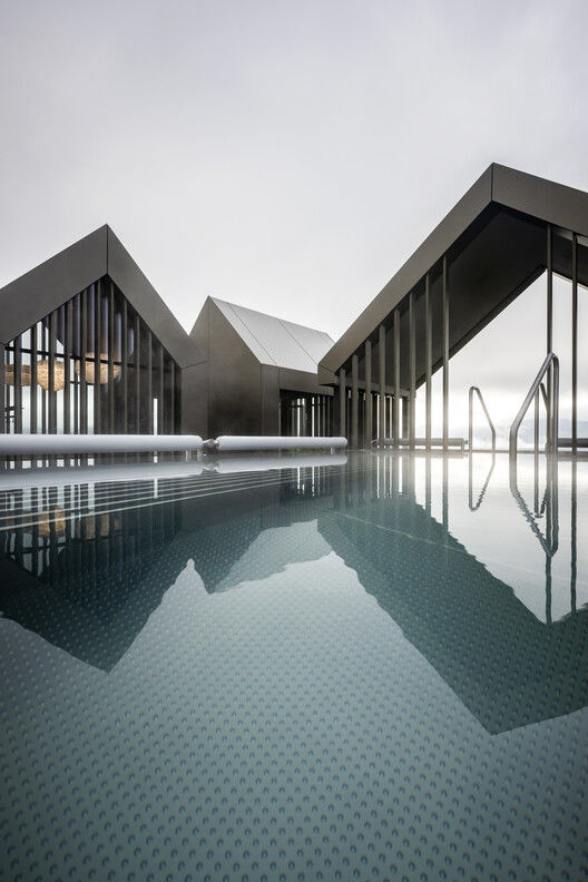 Noa * aided its design with the introduction of a swimming pool and the relationship between the "wooden house center" and water. The inverted building implies reflections on the mirrored lake, and the swimming pool on the central platform seems to be a new horizon in this building.. Through this suspended swimming pool and inverted building, the Hubertus Hotel is symbolically continued, and this structural engineering is impressive.