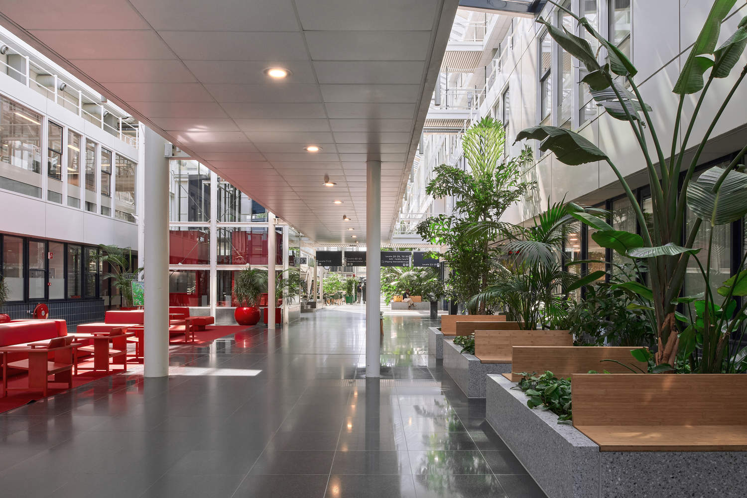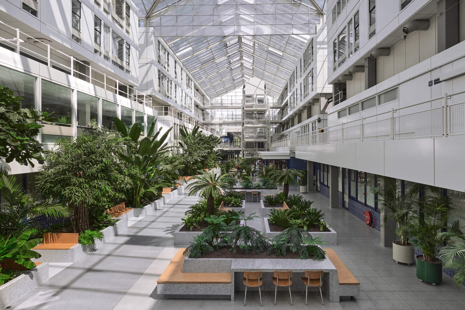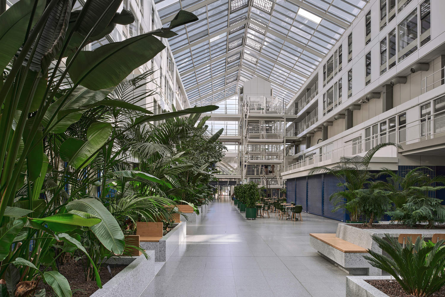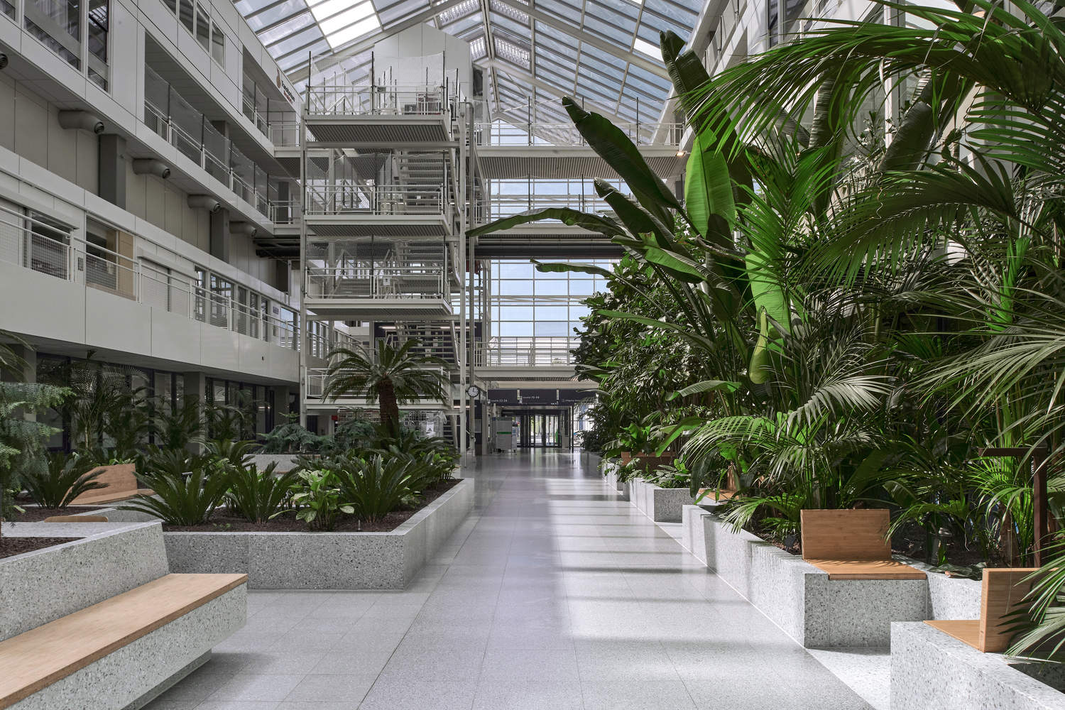 The central hall with sufficient lighting in the hospital has been significantly modified. The initial design was a spacious indoor street with streetlights, green belts, pavilions, mailboxes, and benches. A spacious area is arranged to quickly reach point B from point A, but not as a waiting place. However, today, due to digital appointments and applications, waiting for outpatient appointments or treatments no longer needs to be done in the ward itself, but can be done elsewhere in the building - a change that has spatial implications and offers possibilities. Here, the central hall has replaced the classic waiting room of the outpatient clinic.