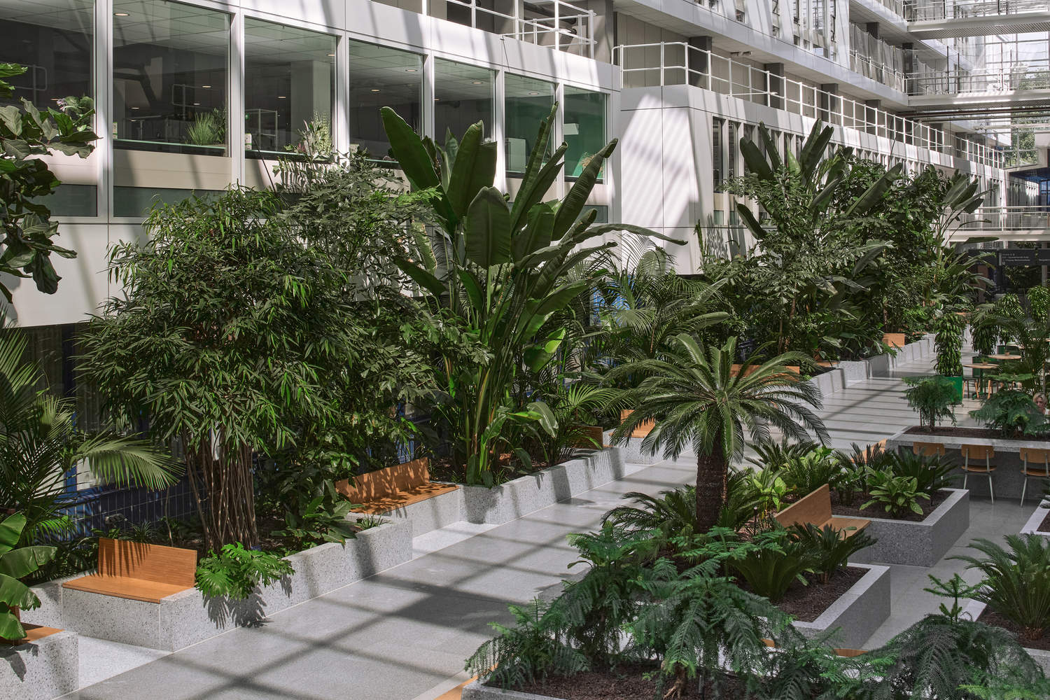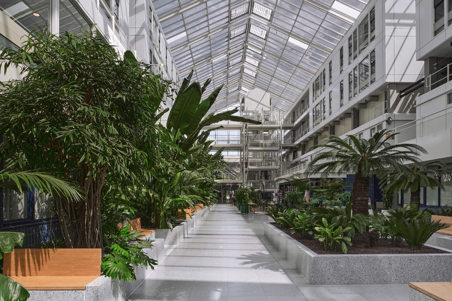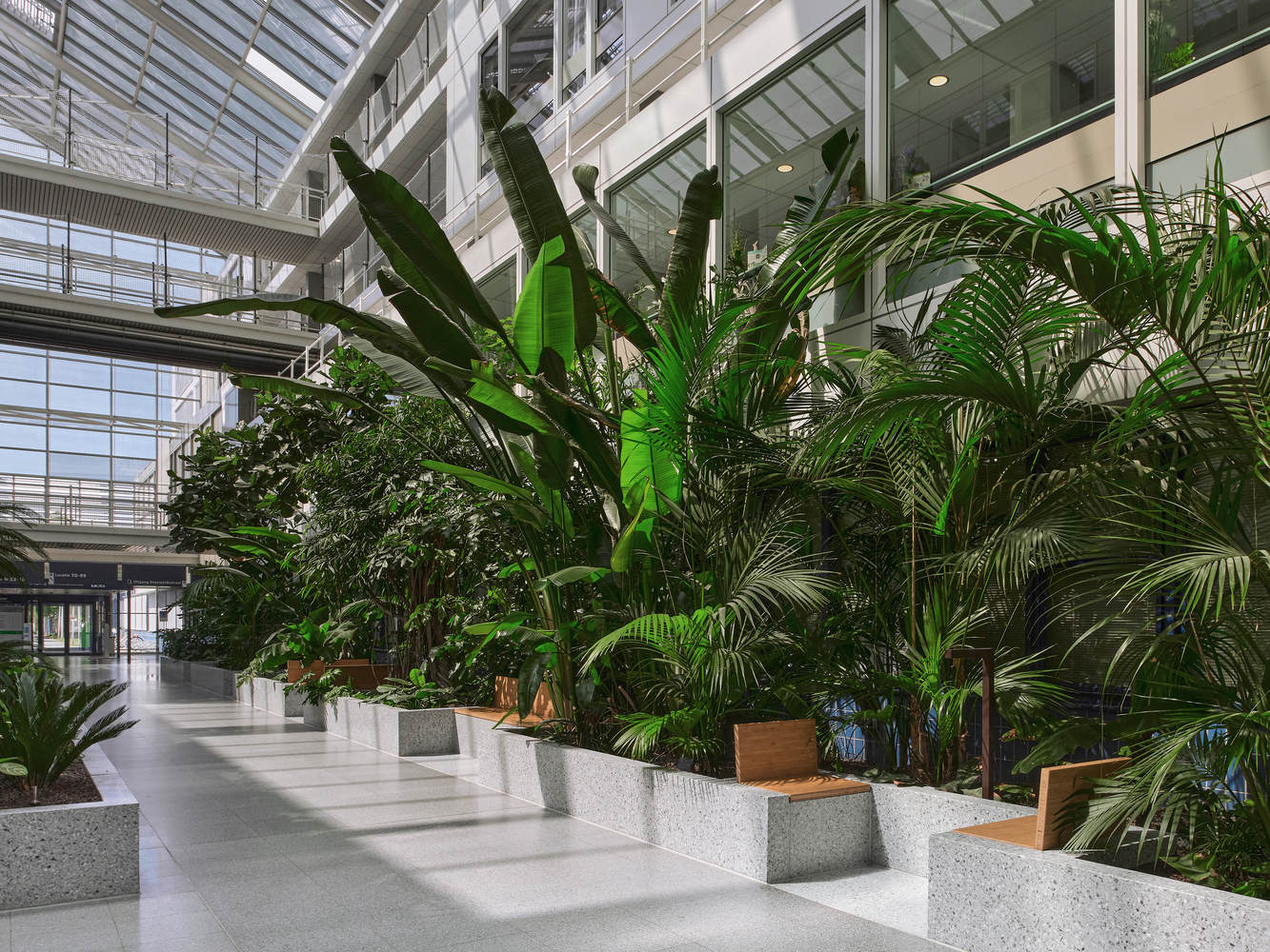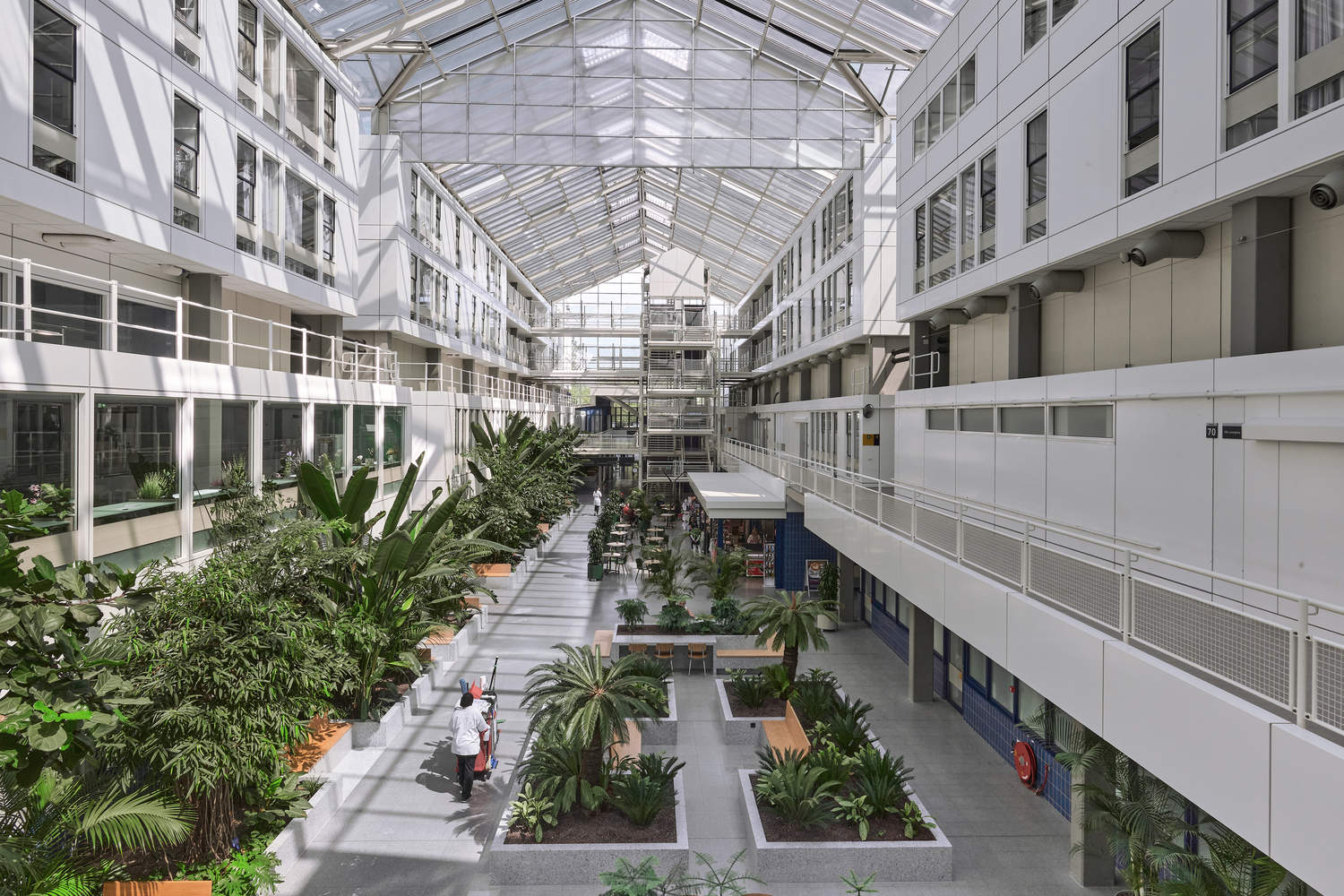 新大厅保留了原有的清晰路线,但增加了捷径,在郁郁葱葱的绿色植物中设有各种座位。 通过将自助餐厅与商店、病人服务点和理发点安置在大厅两侧外墙的蓝色基座上,腾出了空间。
