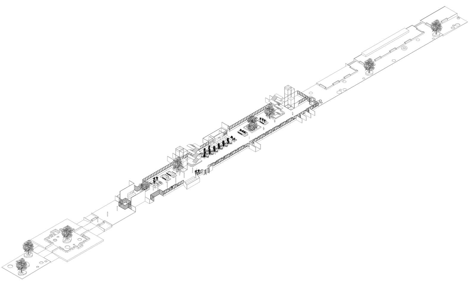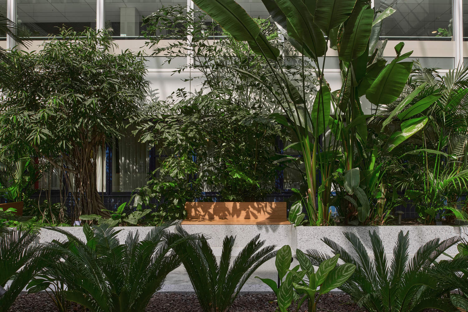 The sparse green plants on the facade have been replaced by lush leaves on the elevated bed with a terrazzo garden wall, and there are also bamboo chairs among the green plants. These vegetation provide privacy for the rooms facing the lobby and offer a view of indoor green plants for the upper floors. The existing red elevator is highlighted by two new red island platforms with sofas and concert grand pianos.