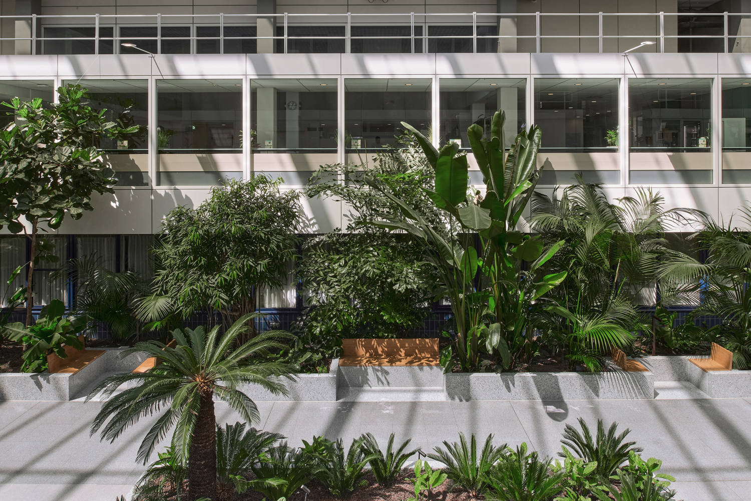 立面上原本稀疏的绿色植物被带有水磨石花园墙的高架床上茂盛的树叶所取代,绿色植物中还有竹椅。这些植被为面向大厅的房间提供了隐私,并为上层提供了室内绿色植物的视野。现有的红色电梯被两个带沙发和音乐会三角钢琴的新红色岛台所突出。
