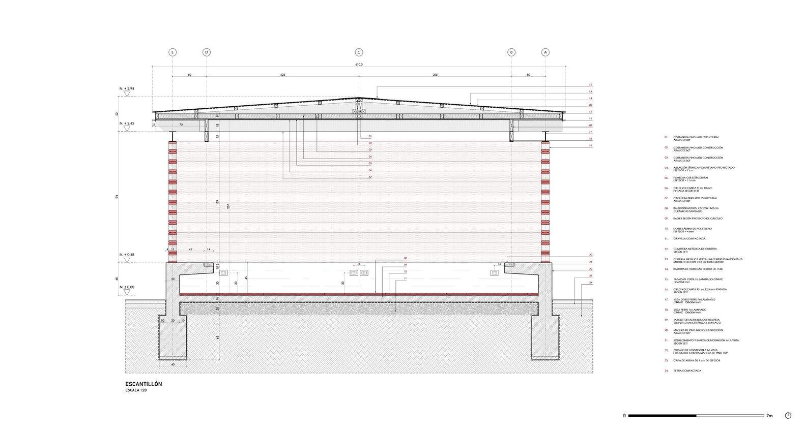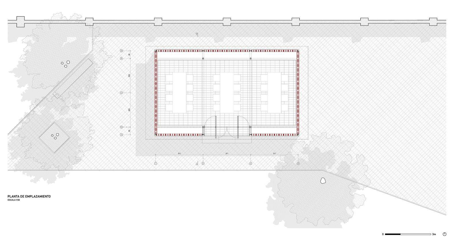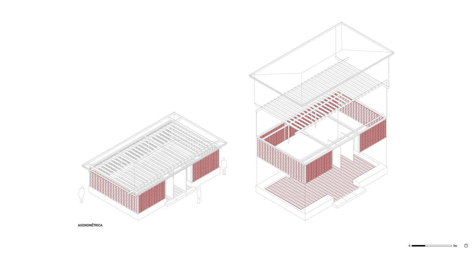 We believe that bricks are a cheap material that can be manufactured in Chile, thereby eliminating huge import costs, and at that time, goods from abroad had already multiplied fivefold. Its well-known construction techniques, resistance to the passage of time, and low maintenance costs seem to be the ideal choice for us to build this cool resting shade. Finally, bricks provide us with the versatility we are looking for to achieve a "holistic" structure, solving the entire building volume with a single primary material and eliminating projects that require specialized high cost labor. The project aims to build a cool shade that resembles vines, allowing filtered natural light to pass through and avoiding direct sunlight. We have envisioned a rectangular plan with a volume parallel to the track, and the construction sequence is very simple: a small pedestal with two concrete benches inside, and this small brick pavilion is built on top of it. The main facade - east-west - consists of two facing grid brick walls, while at both ends - north and south - the volume is completely enclosed by two opaque walls. The volume is completed by a brick pavement - the same size as the modules that make up the walls - and upper wooden beams that support the roof. Two 1.5-meter-wide revolving doors lead to the center of the exhibition hall, with three openings defining the passage: a larger central opening and two smaller horizontal openings.