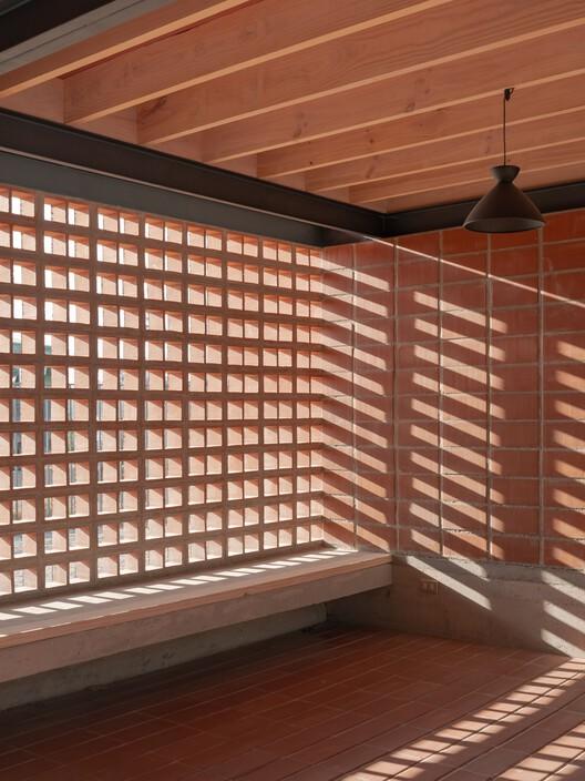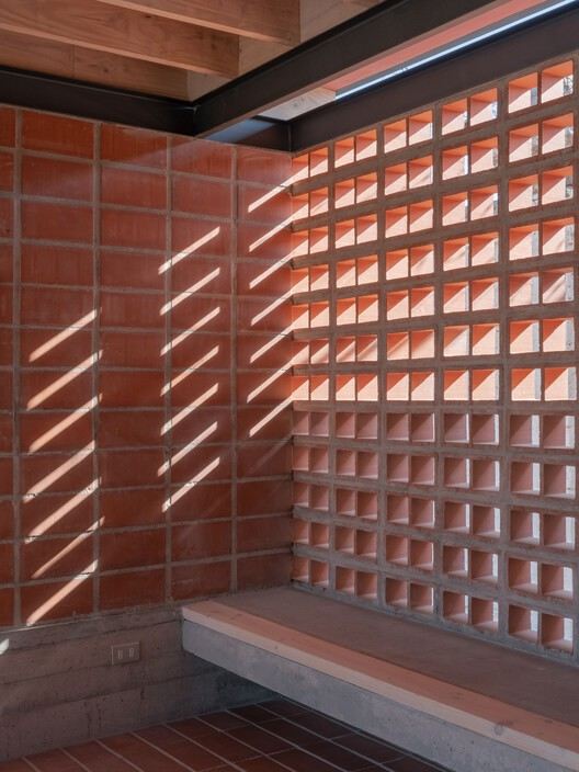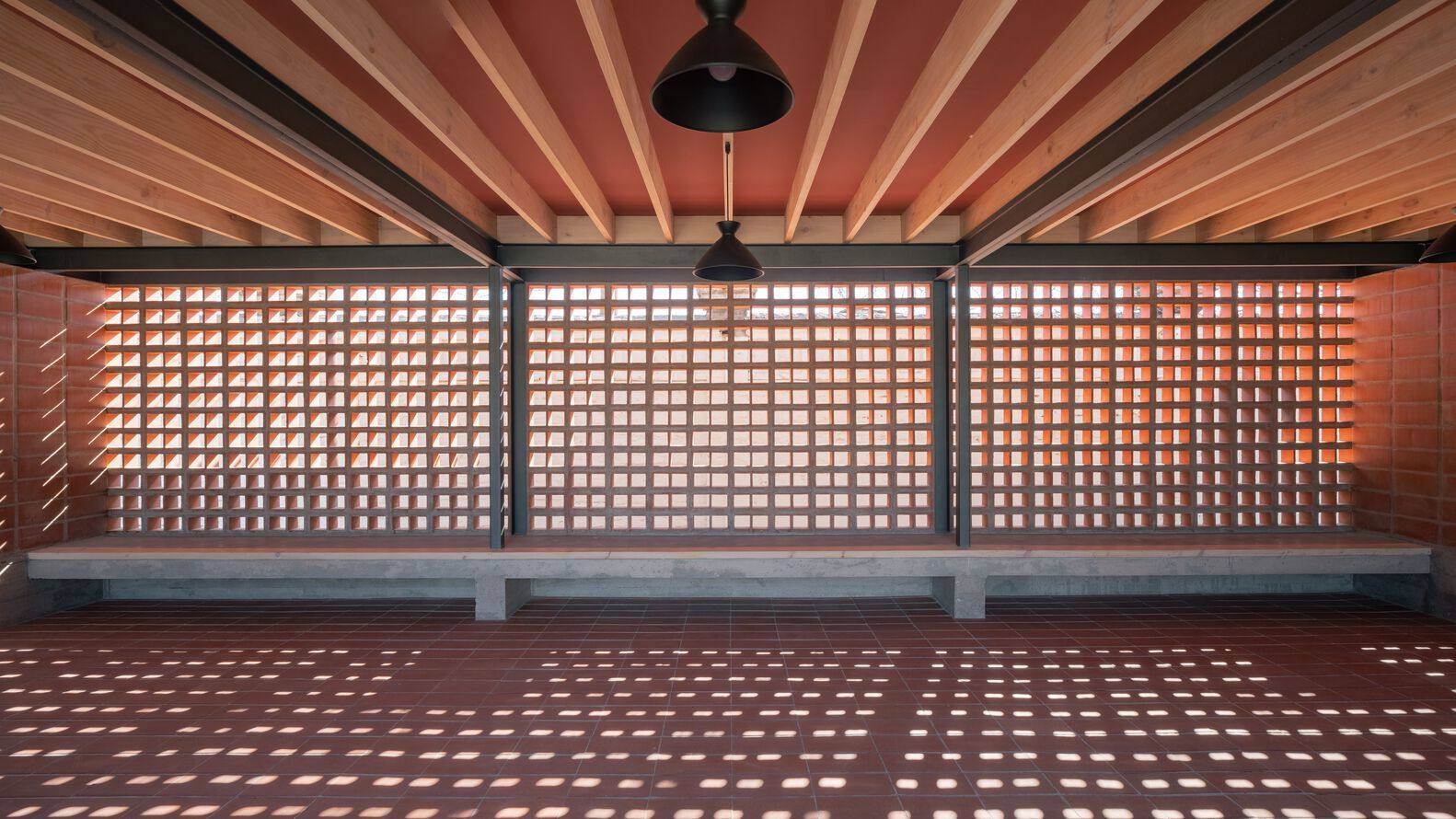 在一天中的不同时间通过格子墙进入的自然光,无疑是该项目最重要的材料。我们可以对任何建筑项目说同样的话,但在这种情况下,没有资源来建造这个空间,格子砖的空隙实际上允许建造这些光墙,为 Hipico 俱乐部园丁的新“凉亭”赋予生命。