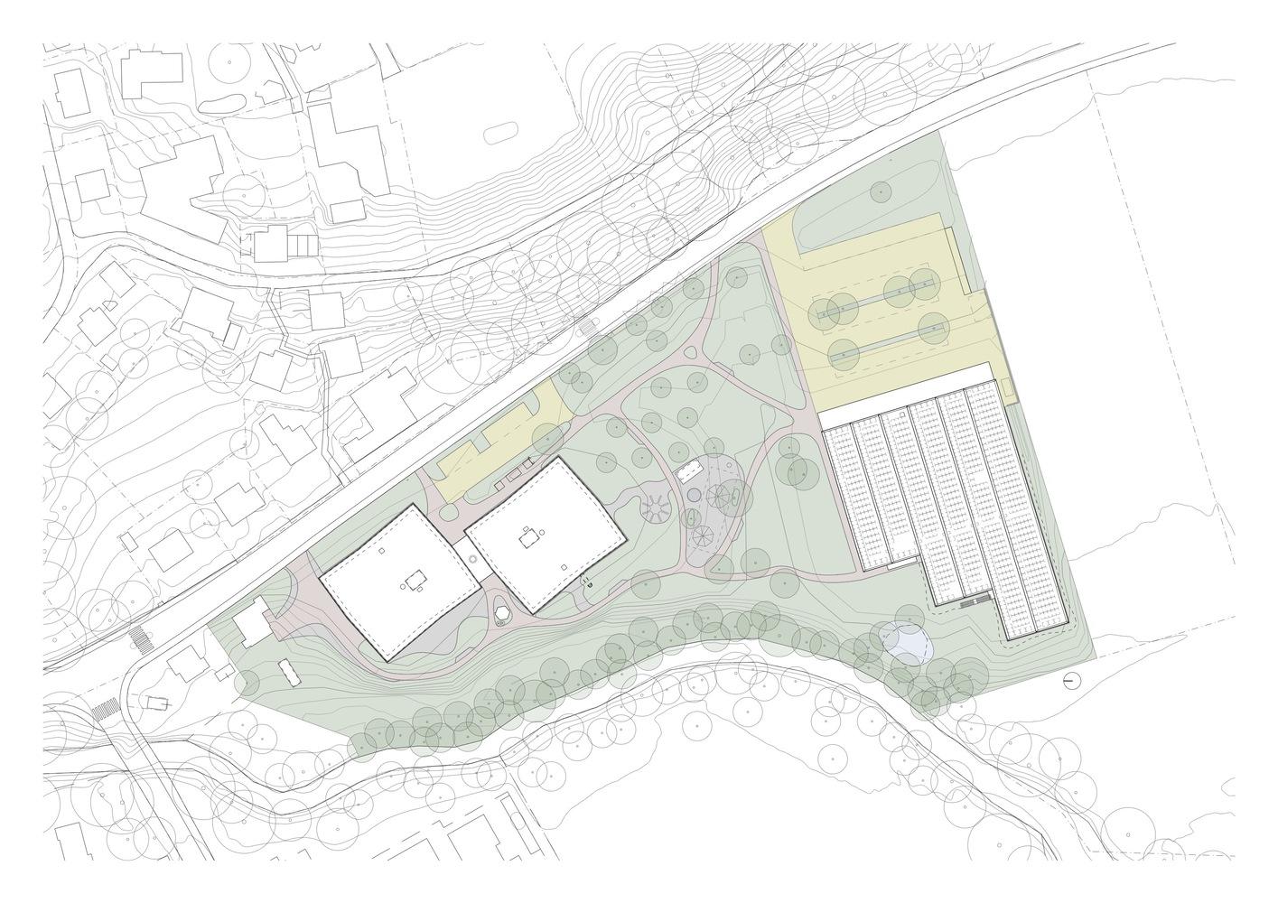 该场地四周环绕着草地、开阔的田野以及树木繁茂的普法夫内伦河(Pfaffneren River)。大自然不仅仅是一个简单的背景;它已然成为这个居住与工作社区的独特标识。