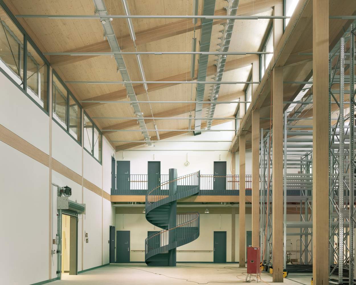 The workshop building features a two-story, hall-like timber structure. Its floor plan is divided into three functional areas, with a large, double-height storage hall in the center – which serves as a transitional zone between the different workshop areas from both an architectural and functional perspective.