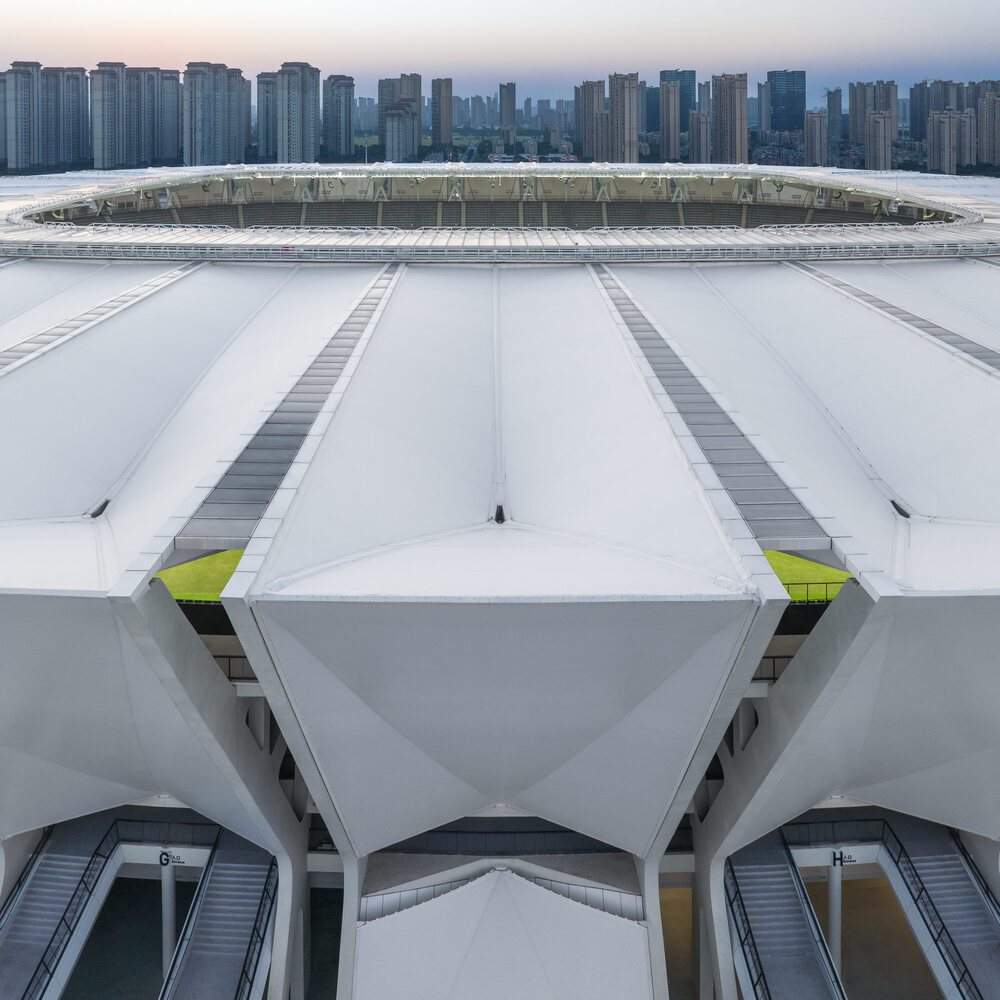 This soap-shaped monolithic structure is supported by 36 pairs of powerful concrete trusses, with flexible cable nets tensioned between each pair of cast-in-place concrete components. This elegant, sculptural support structure was completed in collaboration with sbp Schlaich Bergermann Partner. The roof structure is supported by 36 spatial triangulated steel trusses. The upper chord is an extension of the concrete truss at the roof level, covered with membrane material. The translucent membrane not only provides sun and rain protection but also softly introduces light into the arena. Each exterior facade unit of the cable net structure covers an area of approximately 600 square meters, making it the largest single membrane structure in China to date. The external bridge system outside the stadium allows for fast and smooth entry. Wide staircases guide spectators to the circular podium, and then through 48 bridges to the various tiers of stands. The efficient crowd evacuation function of the bridges was proven during the opening match.