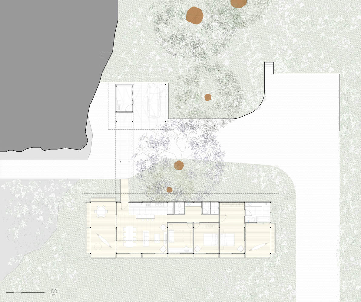无论是材料运输,还是现场施工与实施,建设过程均面临诸多挑战,由此催生了一座轻量化建筑 —— 采用工业化木材打造,既契合了在此斜坡地形中建造单层房屋的愿景,又仅需地面数点支撑。