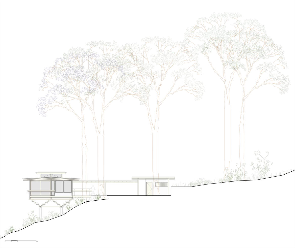 房屋主体部分悬于地面之上,需从最高点经由一条步道方可抵达,宛如一艘静泊于森林上空、海拔 100 米处的船只,静谧而沉稳。