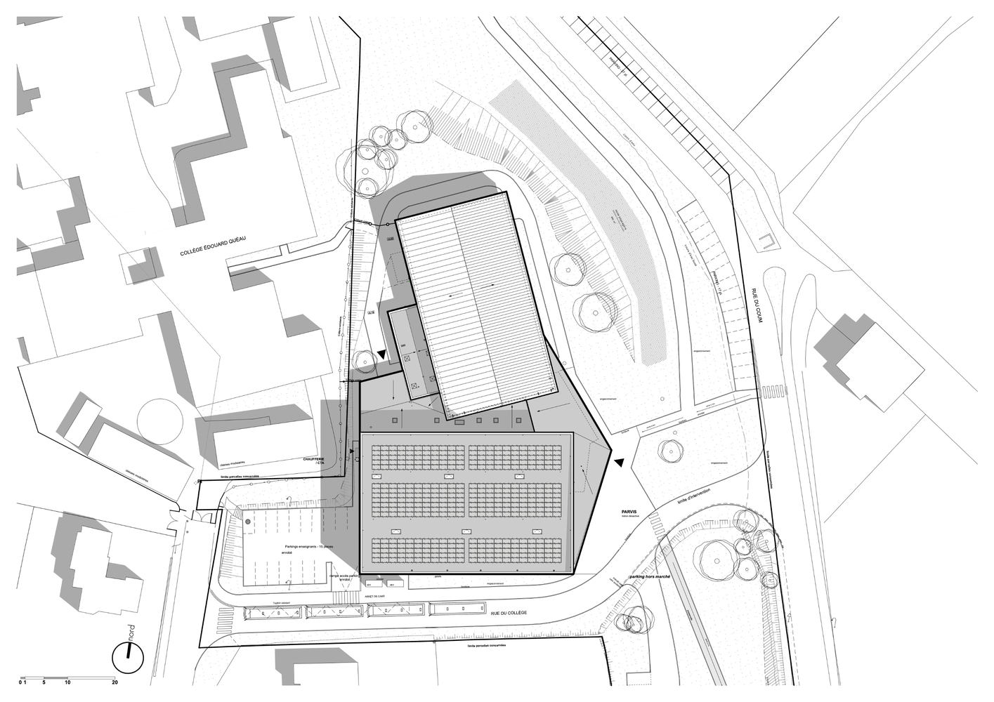 This uniform light is completed by the filtered light from the translucent strip on the entrance facade and the random openings located on the south and west facades. The framework also brings a graphic touch and takes up the bias suggested on the main facade, which contributes to the overall visual.