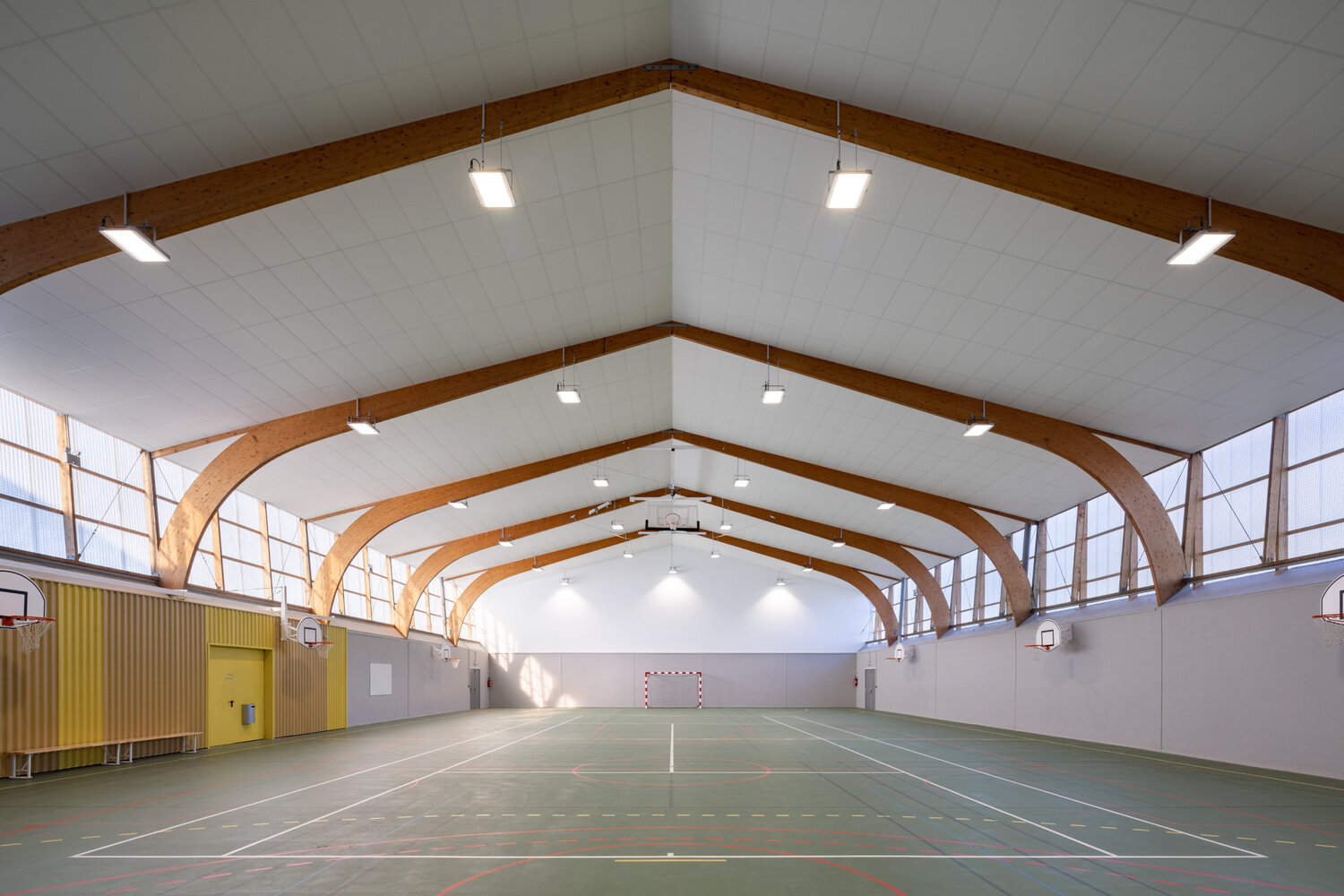 The movement of the facade and the main color used have only one purpose: to create an event. To attract the eye, to promote sport. The gold tones at the entrance and the silver tones of the vertical slats recall the gold and silver medals of sporting competitions. Placed on a darker background, the translucent strip transforms with the light throughout the day and becomes a luminous signal at night.