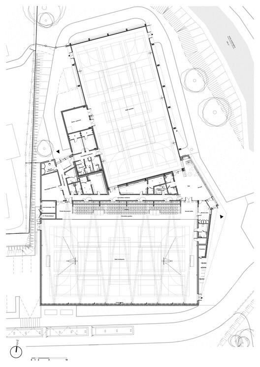 结构逻辑与组织效率的统一:设计巧妙地利用了现有建筑的结构骨架,并通过压缩两个房间之间的空间,有效地组织了流线和功能布局。这一改造过程中,原有的实施约束被转化为组织项目的有力支撑。看台后的循环动线构成了两个场馆的“骨干连接”,将入口大厅与现有入口流畅地串联起来。这种在限制中寻求高效布局的策略,体现了严谨的建筑逻辑,确保了改造后的复杂体量在功能上实现了清晰、简单且高效的运作。