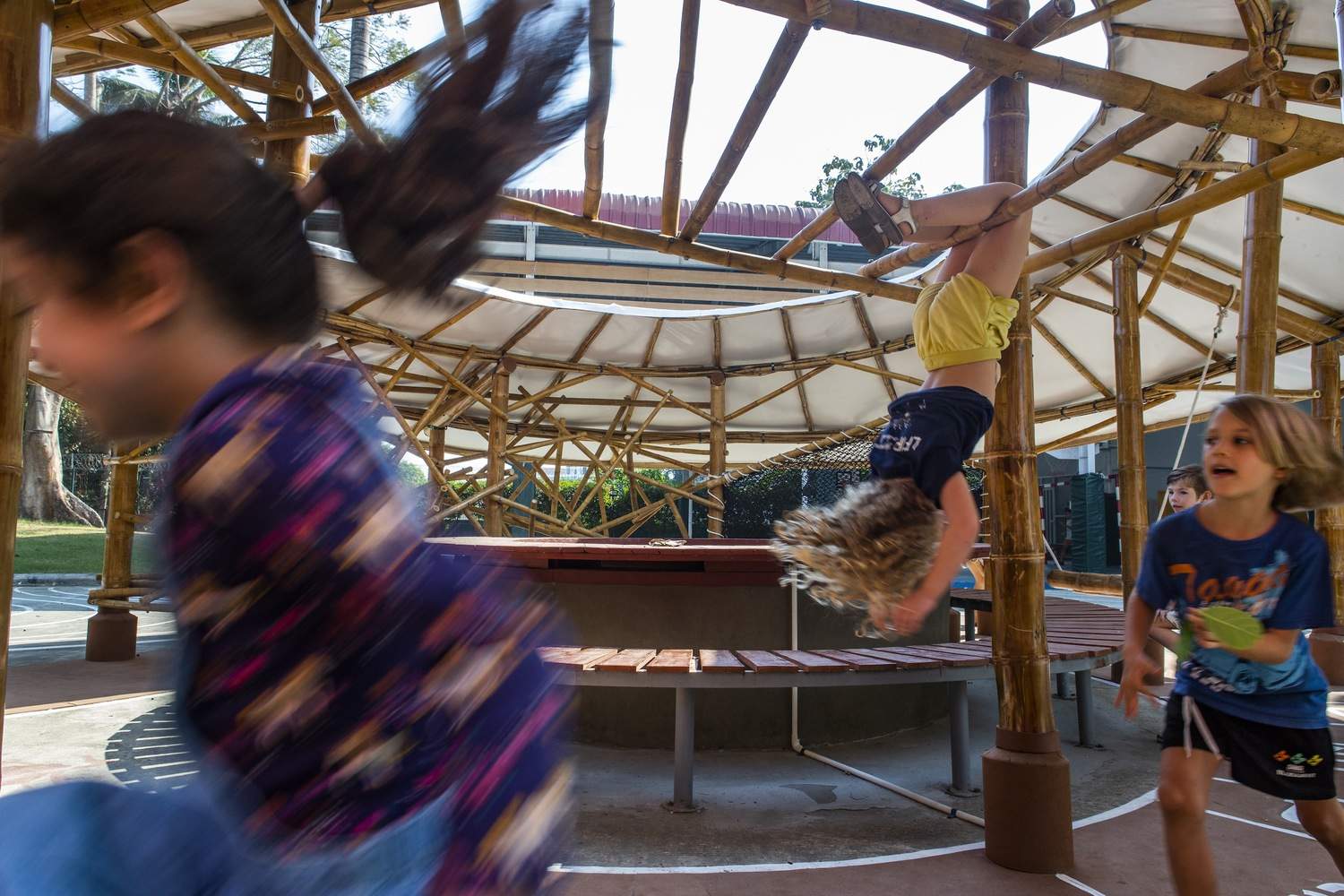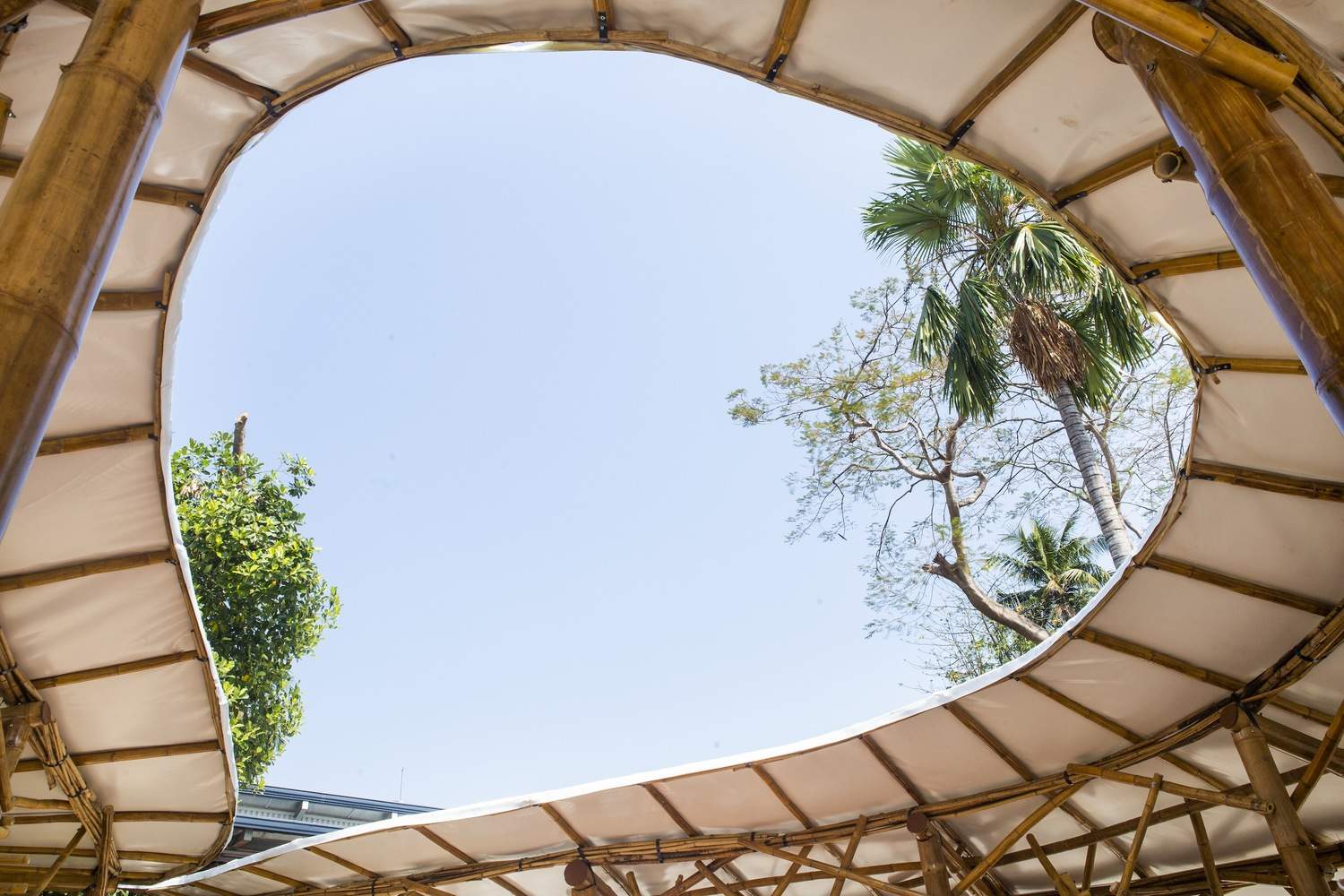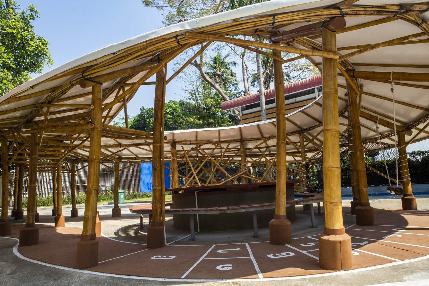 The entire structure is made of three different varieties of bamboo: Dendrocalamus giganteus for the frame, Oxytenanthera albocialiata Munro for the curved elements, and Thysostachys siamensis for the supports and roof beams. The two openings of the ∞ shape house the existing trees and seating areas for teachers to monitor the children while resting.