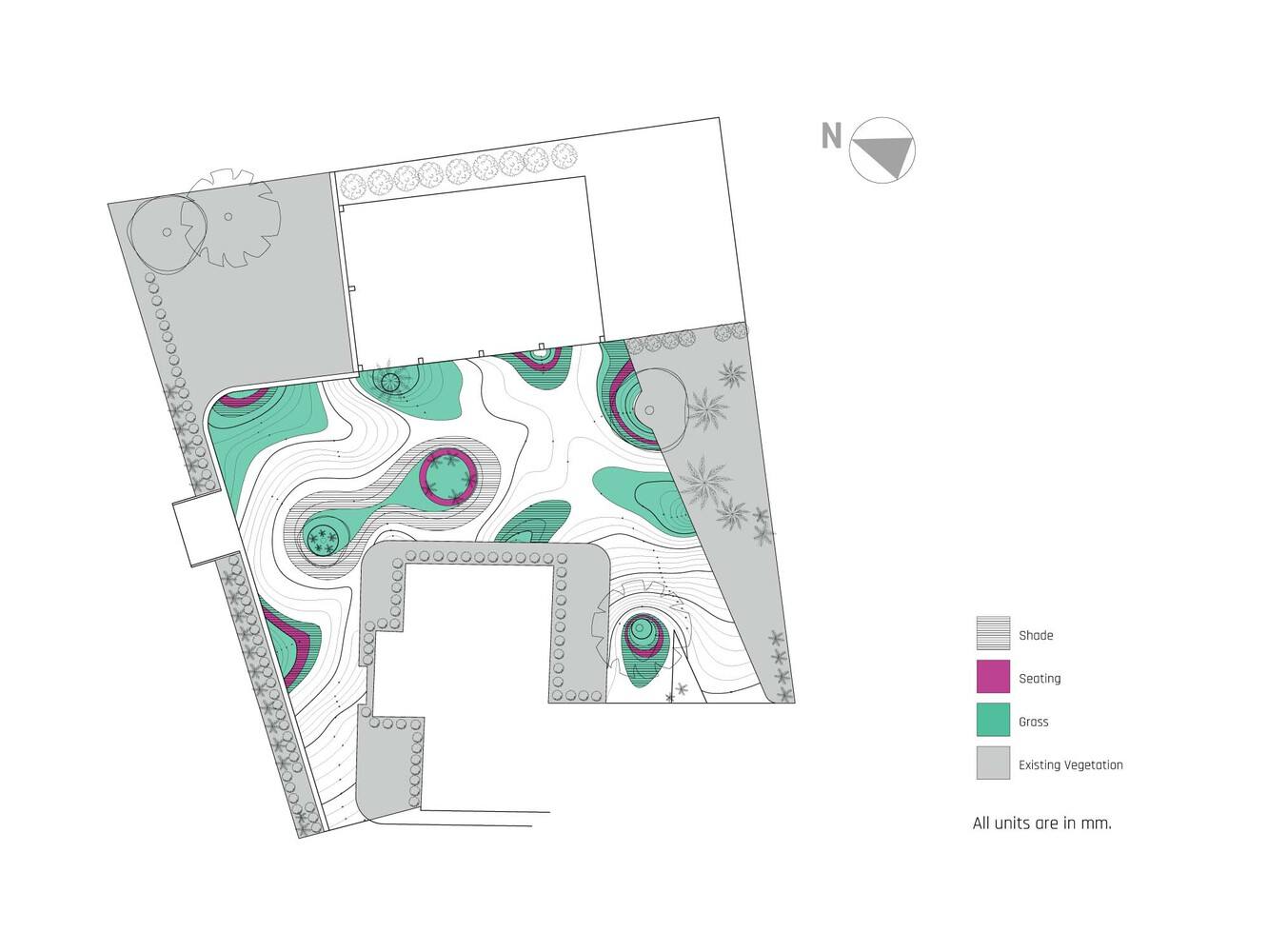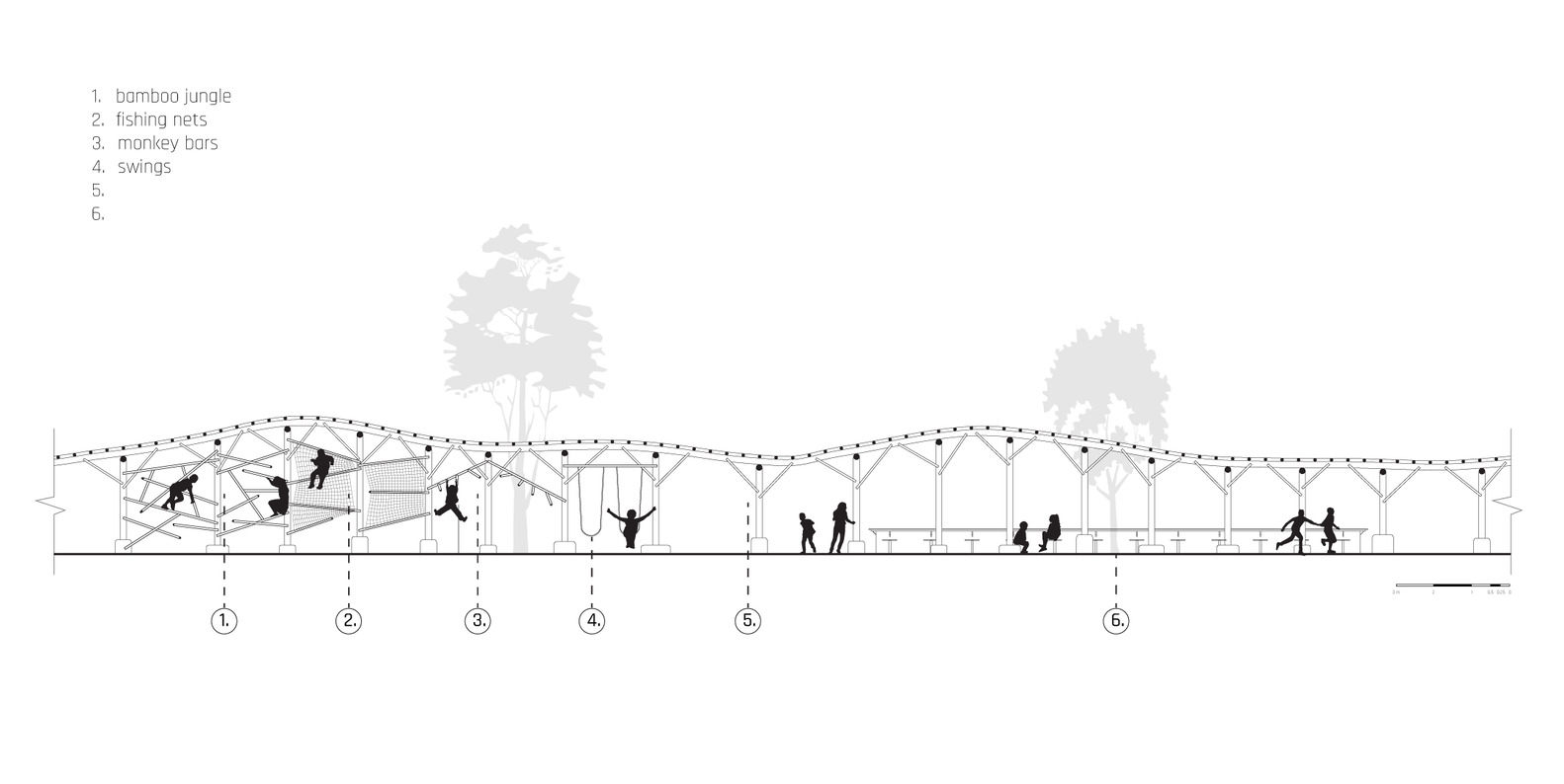 该项目围绕场地上现有的两棵树编织成一个无限符号∞的结构。在这个结构下设有一系列游戏:先是竹竿攀爬、鱼网攀爬、过云梯、坐秋千,最后是缅甸式跳格子,依次重复进行。这些游戏结合起来创造了一个无限长的障碍赛跑道。
