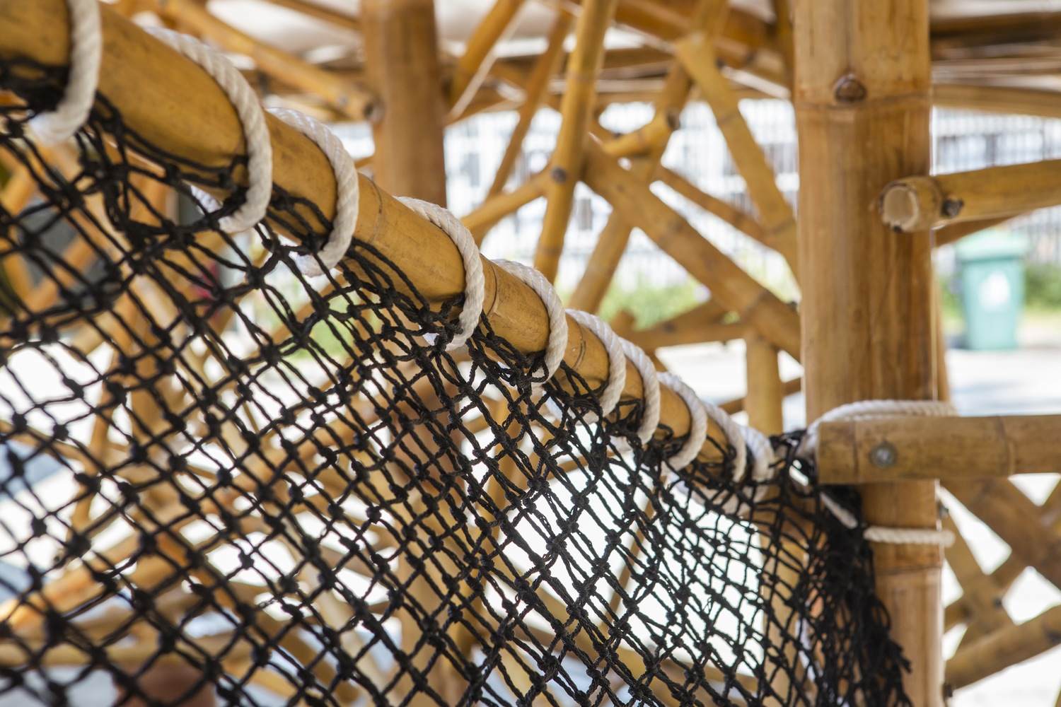 以本土材料构建的动态无限循环游戏体验:该项目最精髓之处在于其对本土竹材的巧妙运用和对传统游戏模式的创新重构。设计以场地上的两棵现有树木为核心,构建了一个象征性的无限符号(∞)结构。这种结构不仅巧妙地限定了空间,更通过连续串联的缅甸式游戏元素(如竹竿攀爬、跳格子等),将原本静态的混凝土地面转化为一个无终点的、动态的障碍赛跑道。三种不同规格和用途的竹材(龙竹、锐药竹、泰竹)的精确选择和应用,展现了对材料性能的深刻理解,实现了结构美观与功能性的完美统一,体现了极高的在地化设计智慧。