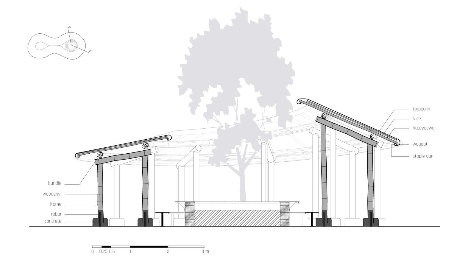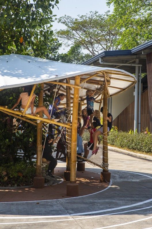 整个结构由三种不同品种的竹子制成,龙竹(Dendrocalamus giganteus )用于框架,锐药竹(Oxytenanthera albocialiata Munro)用于弧形元素,而支撑和屋顶梁则采用泰竹(Thysostachys siamensis )。 在∞形状的两个开口内是场地的既有树木和座位空间,供教师休息的同时能够随时视察孩子们的情况。