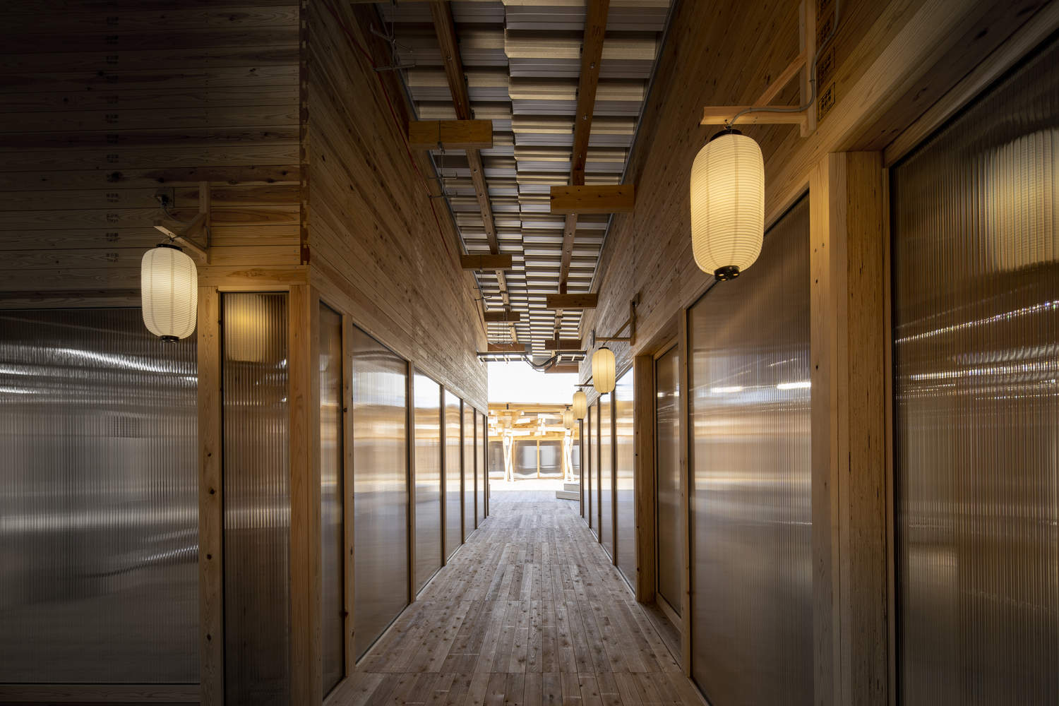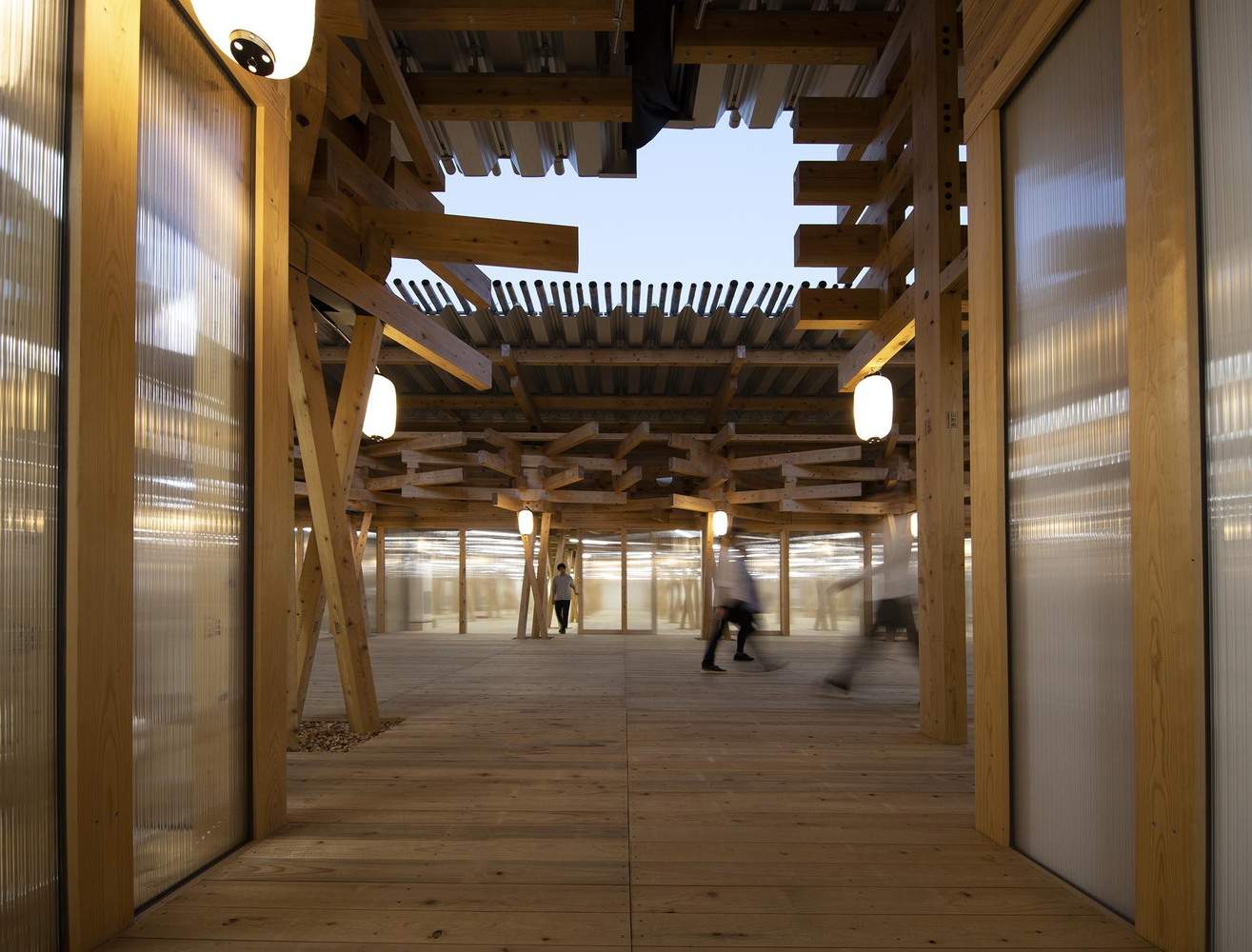 带有独立房间和街道花园的互动空间。广场的主要设施被设计成单层建筑,每个人都可以轻松进入与使用,同时还考虑到了残疾运动员和其他相关人员的需求。建筑师将整个项目分成独立的结构,并通过一个街道花园将其完全整合在一起。这一效果在传统的日本建筑中非常常见,空间形态类似门廊,头顶的屋檐面向运河微风敞开。得益于临时建筑的轻盈和木材的柔软,项目创造了一个展现日本魅力的庆典空间,也是奥运村的“门面”担当。