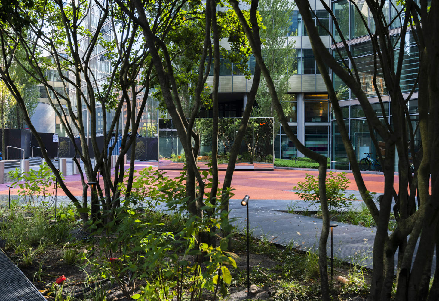 The Nike Experience Hub features a green roof, surrounded by a secluded, comfortable pocket park designed by landscape firm CapattiStaubach in Berlin. Here, lush Amelanchier Lamarckii trees create an urban oasis for Berlin's bird population.